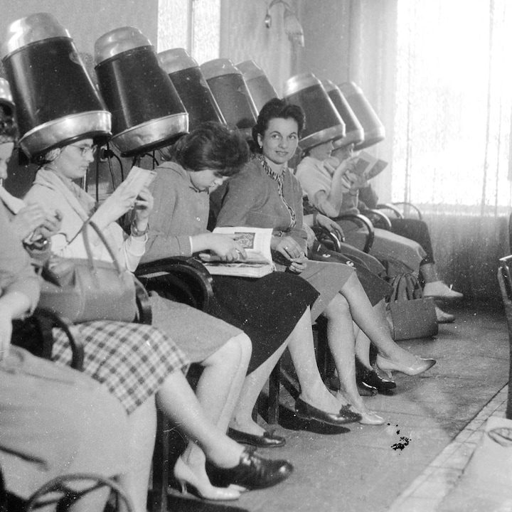 Tidens mode dikterede krøller og bølger, hvilket ofte krævede både lange og dyre frisørbesøg, hvor man skulle sidde længe under en såkaldt tørrehjelm med papilotter i håret.
