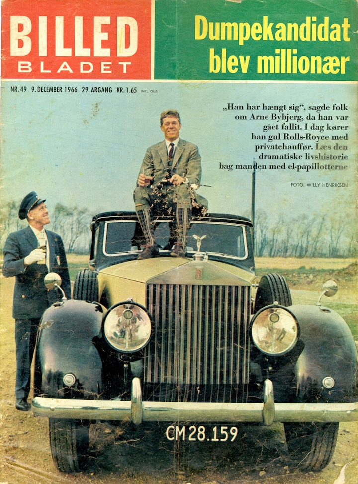 Millionerne væltede ind, og Bybjerg fik både privatfly, hurtige biler og chauffør, som han ofte poserede med i pressen – som herover på forsiden af Billed-Bladet i 1966.