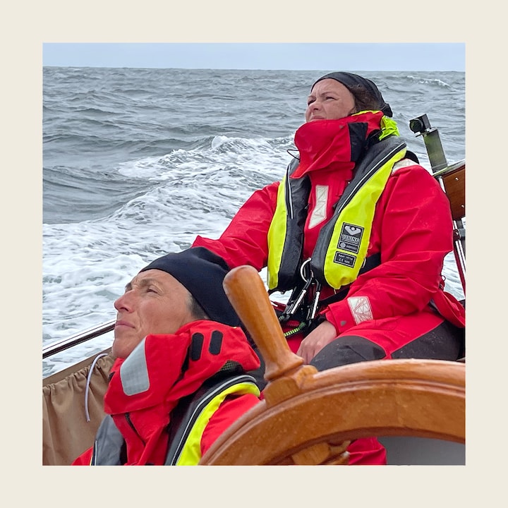 Nede i sin køje ligger Karin Steen Steffensen, mens hendes to døtre står ved roret på dækket. De befinder sig midt ude på Nordatlanten.