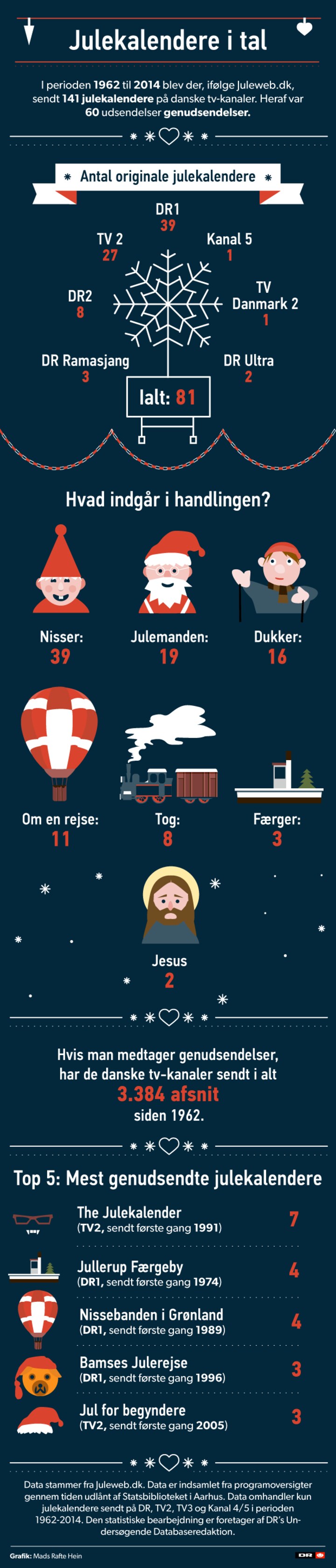 Vidste du for eksempel, at den mest genudsendte kalender er TV 2’s The Julekalender? At mindst 39 af 81 originale kalendere har involveret nisser, men kun to har haft Jesus som omdrejningspunkt?