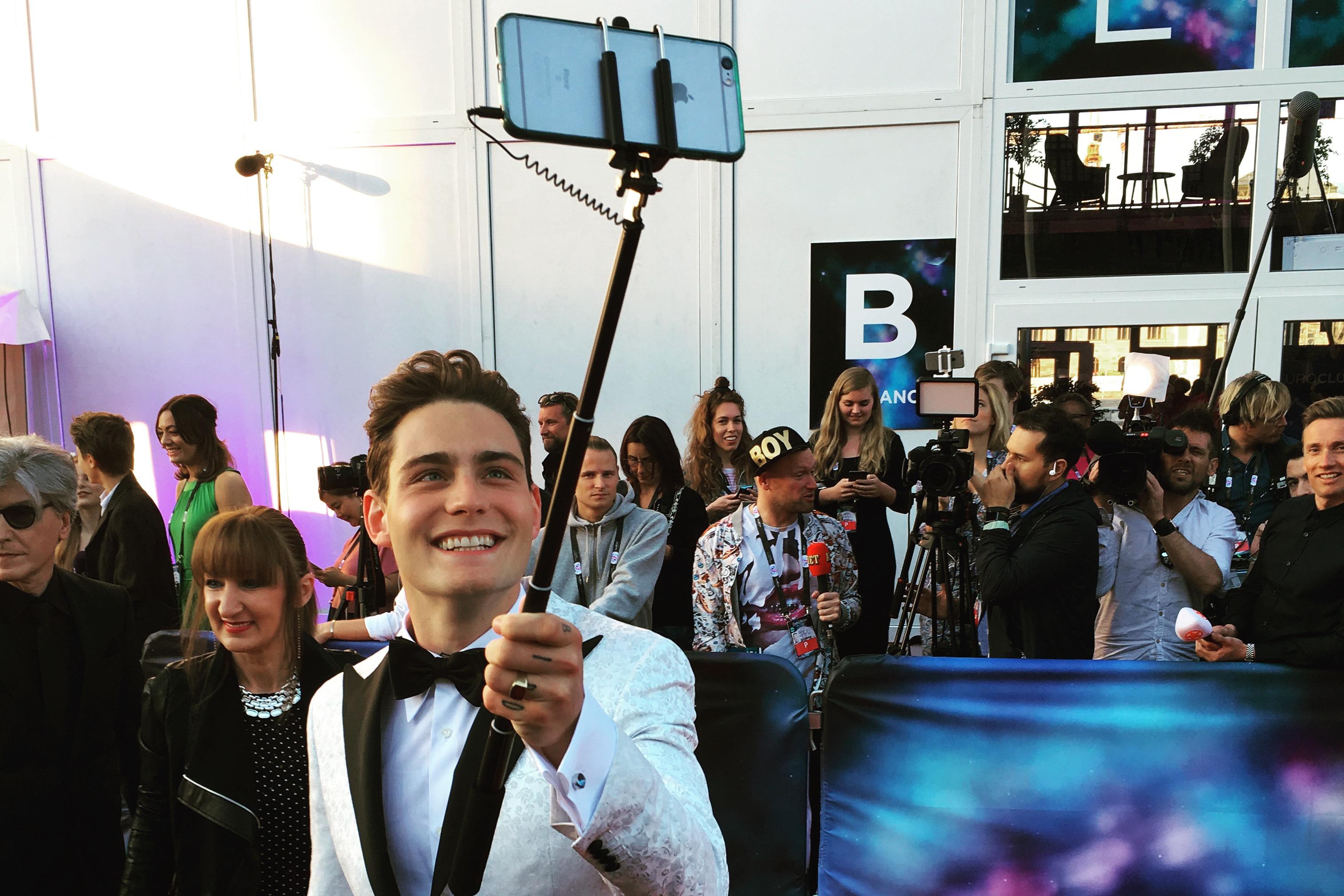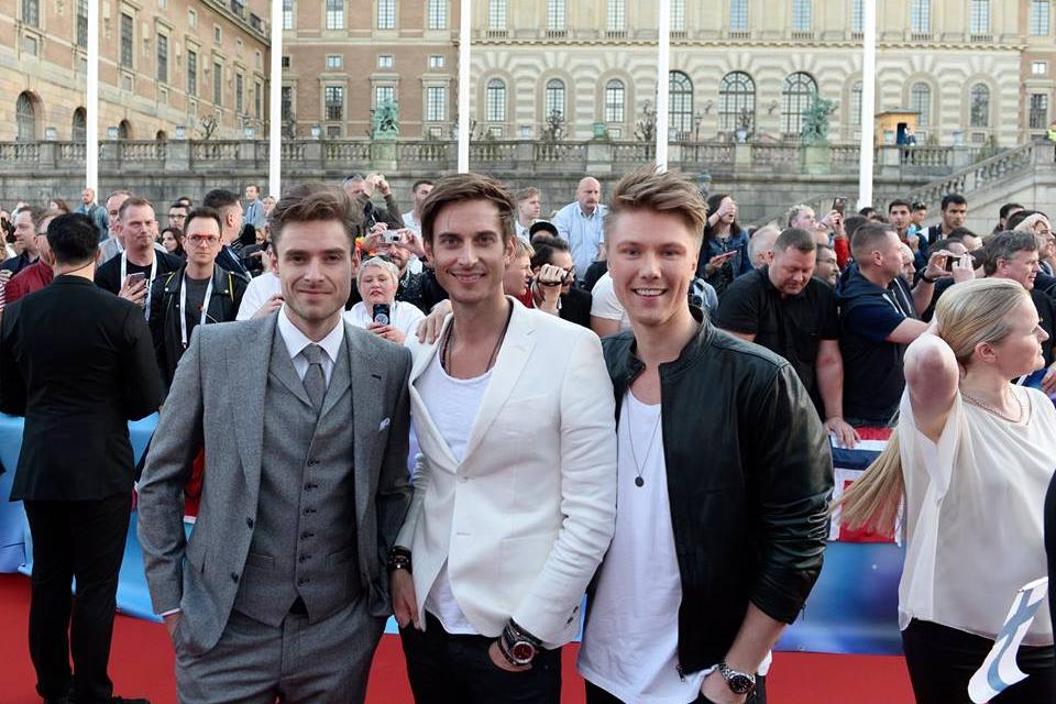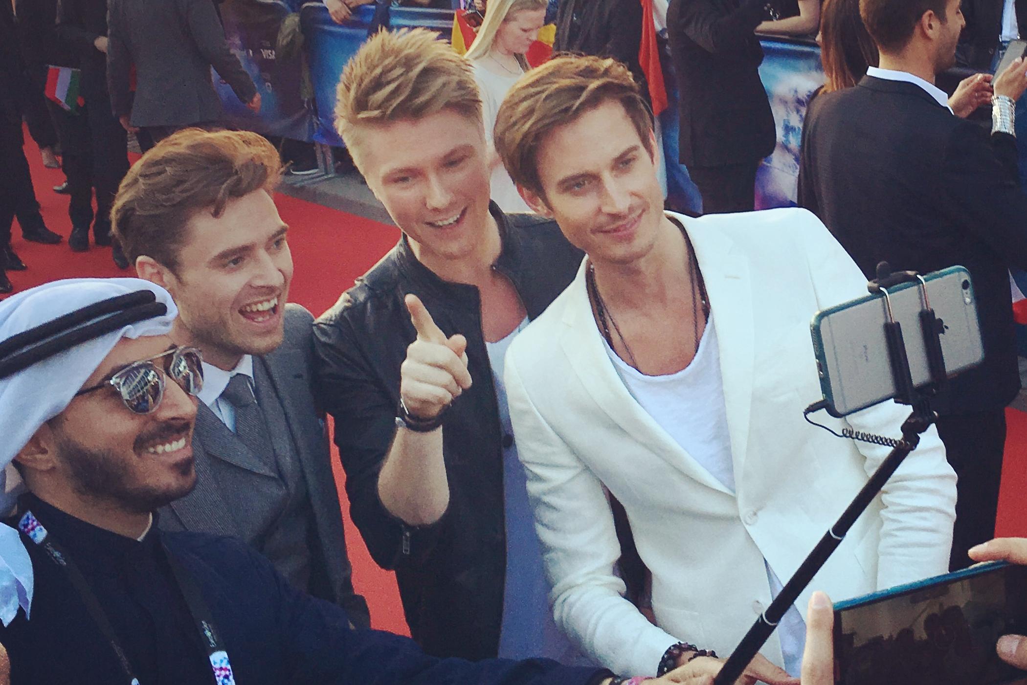 De danske drenge fra Lighthouse X på den røde løber. Martin Skriver var, ligesom de to andre bandmedlemmer, i strålende humør: "Vi har nok taget fire hundrede millioner selfies" (Foto: © Pontus Lundahl/TT, Scanpix)