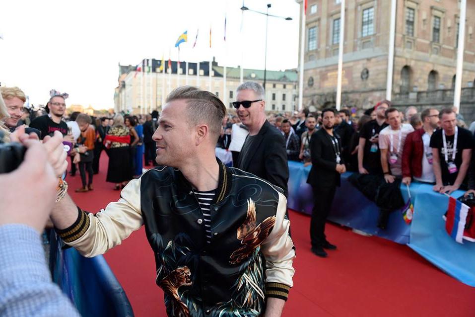 Sidste års vinder, Måns Zelmerlöw, var naturligvis en ombejlet herre til åbningsfesten. (Foto: © Pontus Lundahl/TT, Scanpix)