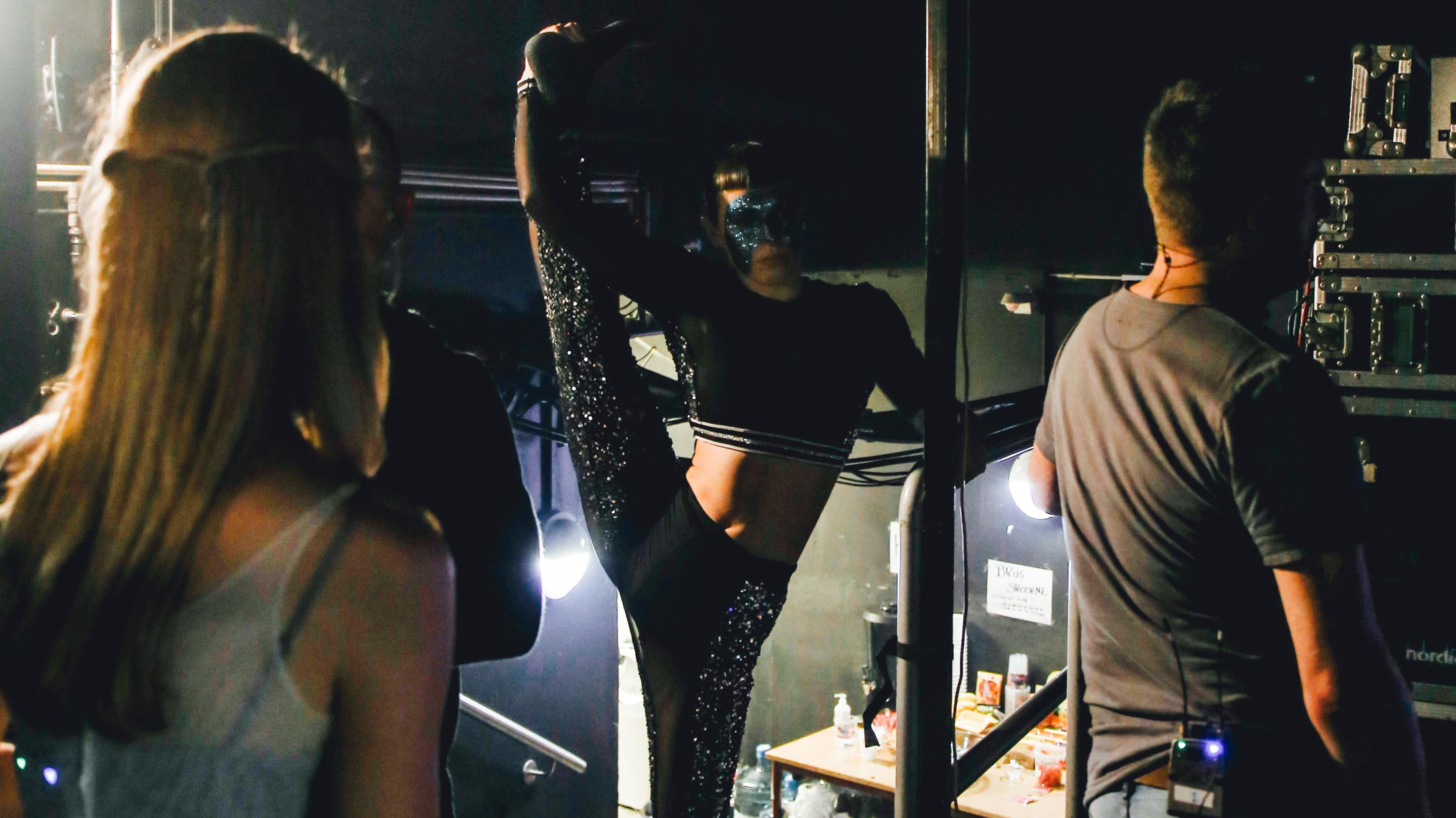 Luftakrobaten, der var en del af Muri og Marios optræden strækker ud, inden hun skal ind på scenen. (Foto: © Frederik Højfeldt Nielsen, DR)