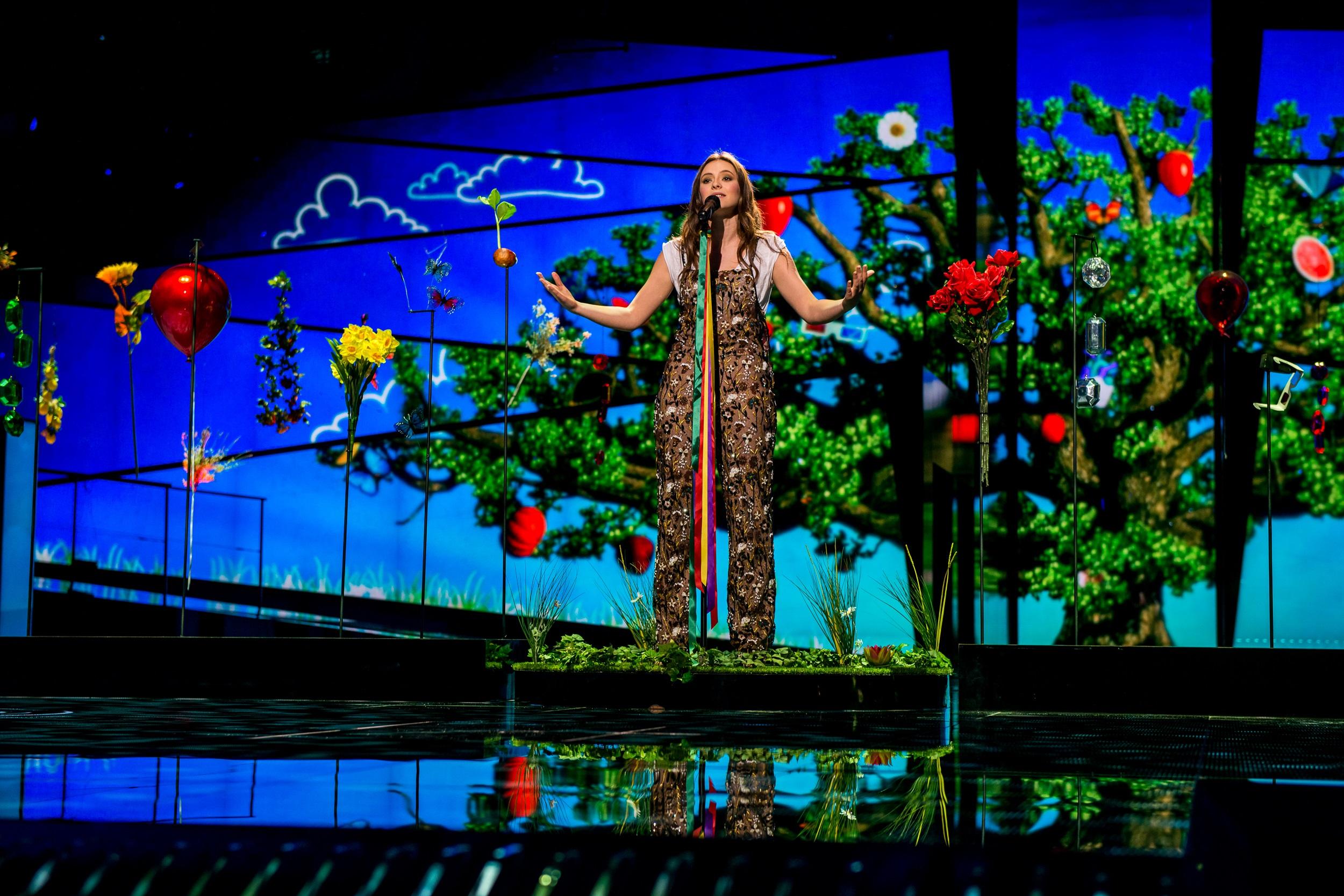 Italienske Francesca Michielin stråler på scenen. (© eurovision.tv)