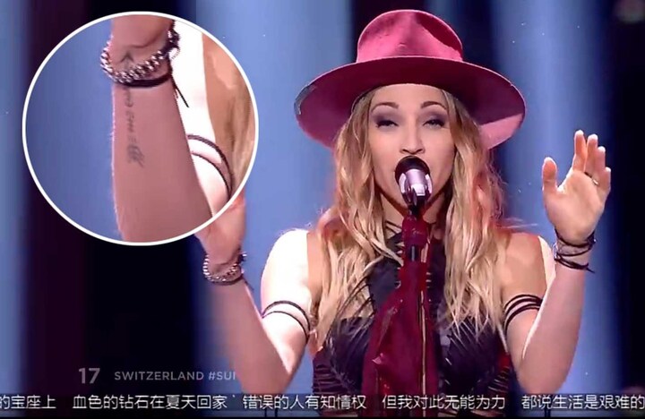 Også Schweiz’ bidrag blev udsat for censur, da tv-kanalen valgte at sløre den schweiziske sangerindes tatovering på højre arm, som det ses på billedet herunder. Deres optræden fik dog trods sløring lov til at blive i udsendelsen.