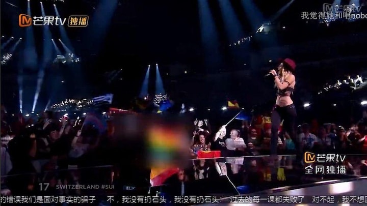 Også regnbueflag, der er kendt som et symbol for homoseksualitet, blandt publikum blev sløret under udsendelsen.