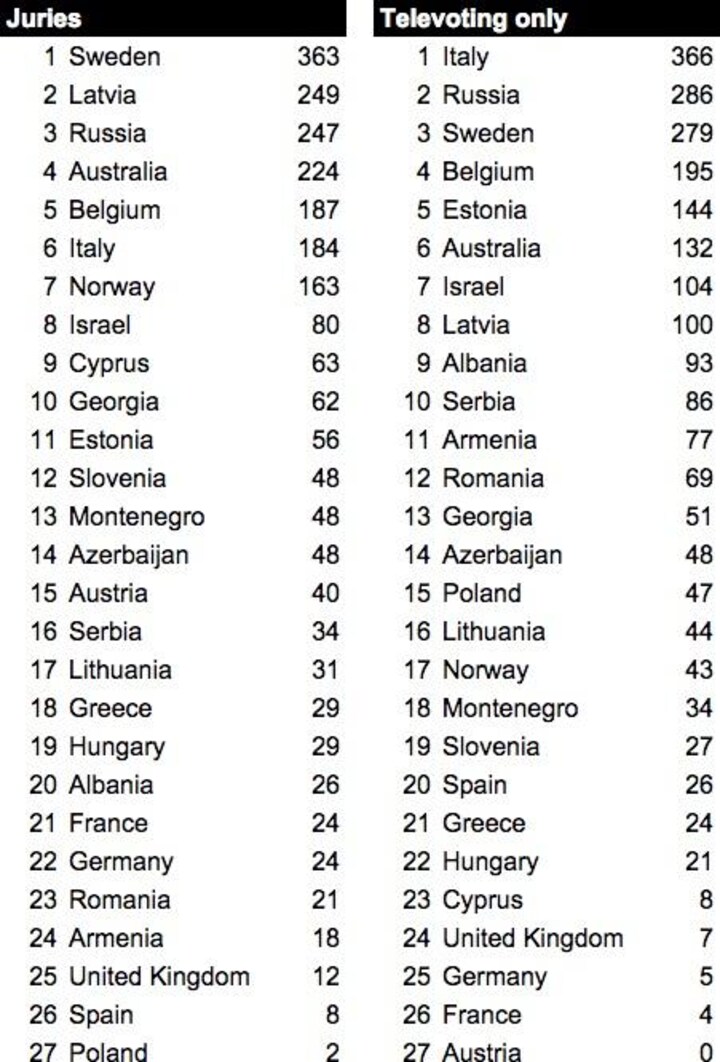 Dermed endte det samlede, kombinerede jury- og seerresultat altså med en førsteplads til Sverige, en andenplads til Rusland og en tredjeplads til Italien.