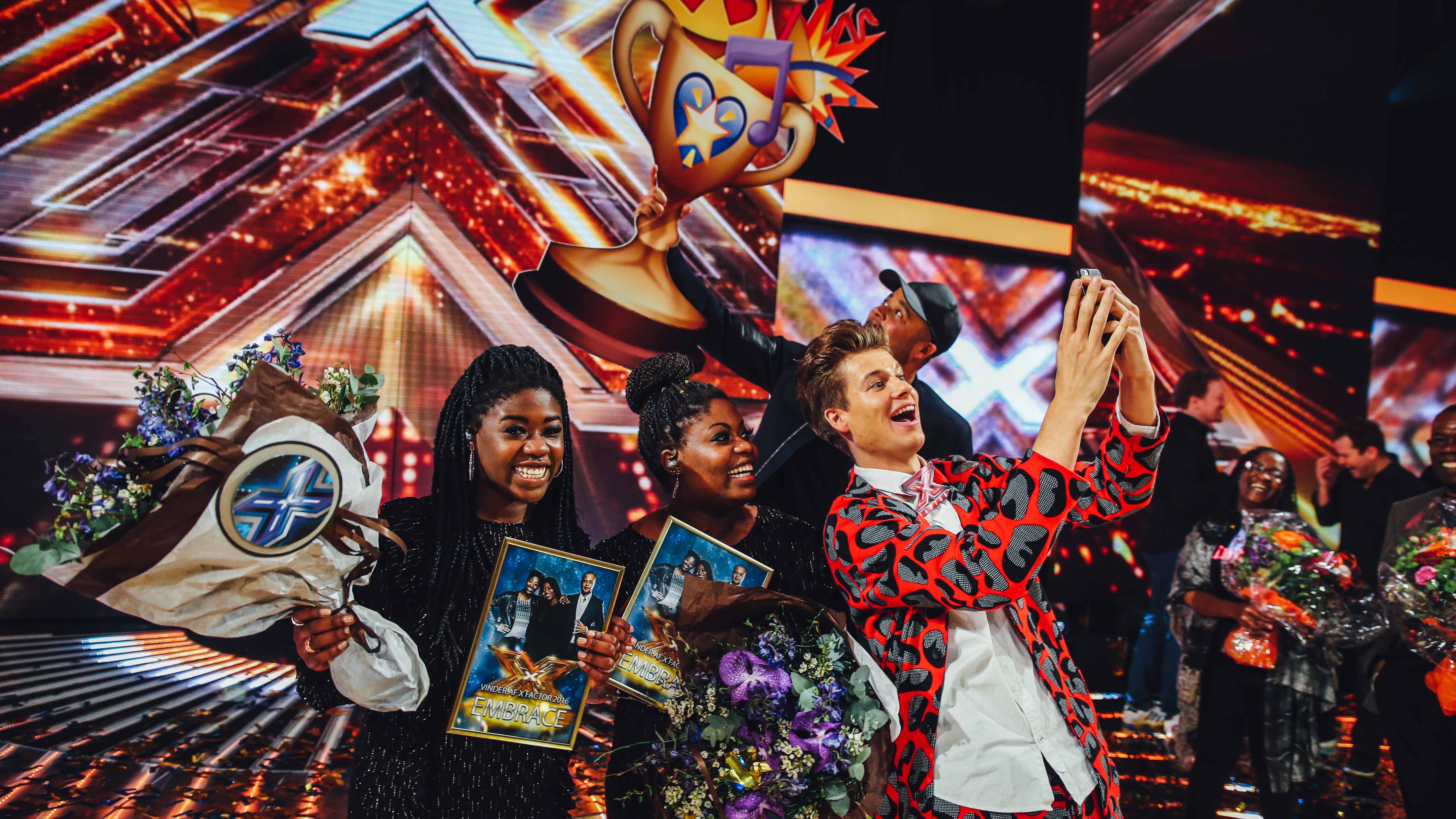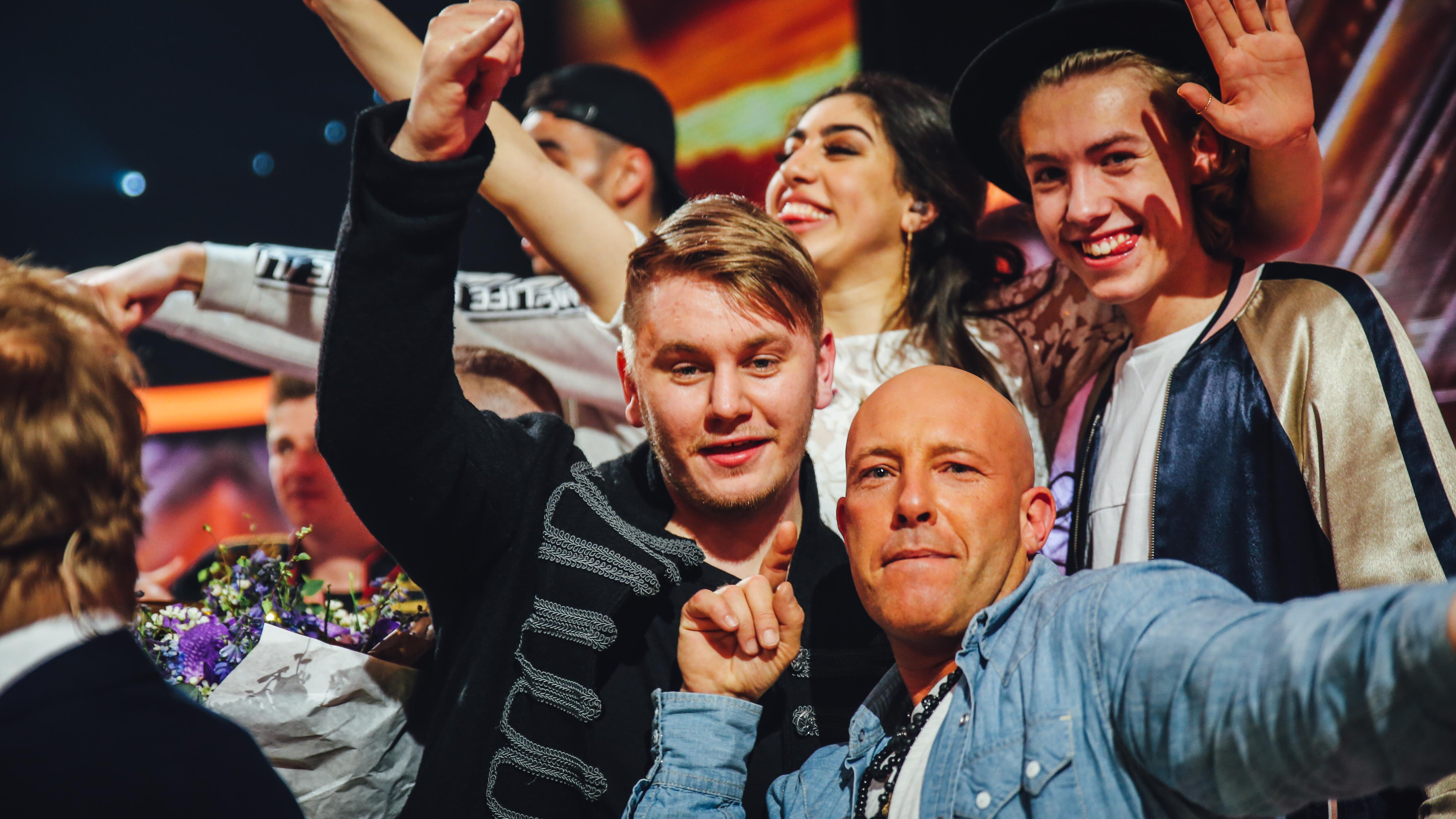 Reem og Alex måtte desværre gå tomhændede hjem. De øvrige livedeltagere var med på scenen, da EMBRACE blev kåret som vindere. (Foto: © Frederik Højfeldt Nielsen, DR)