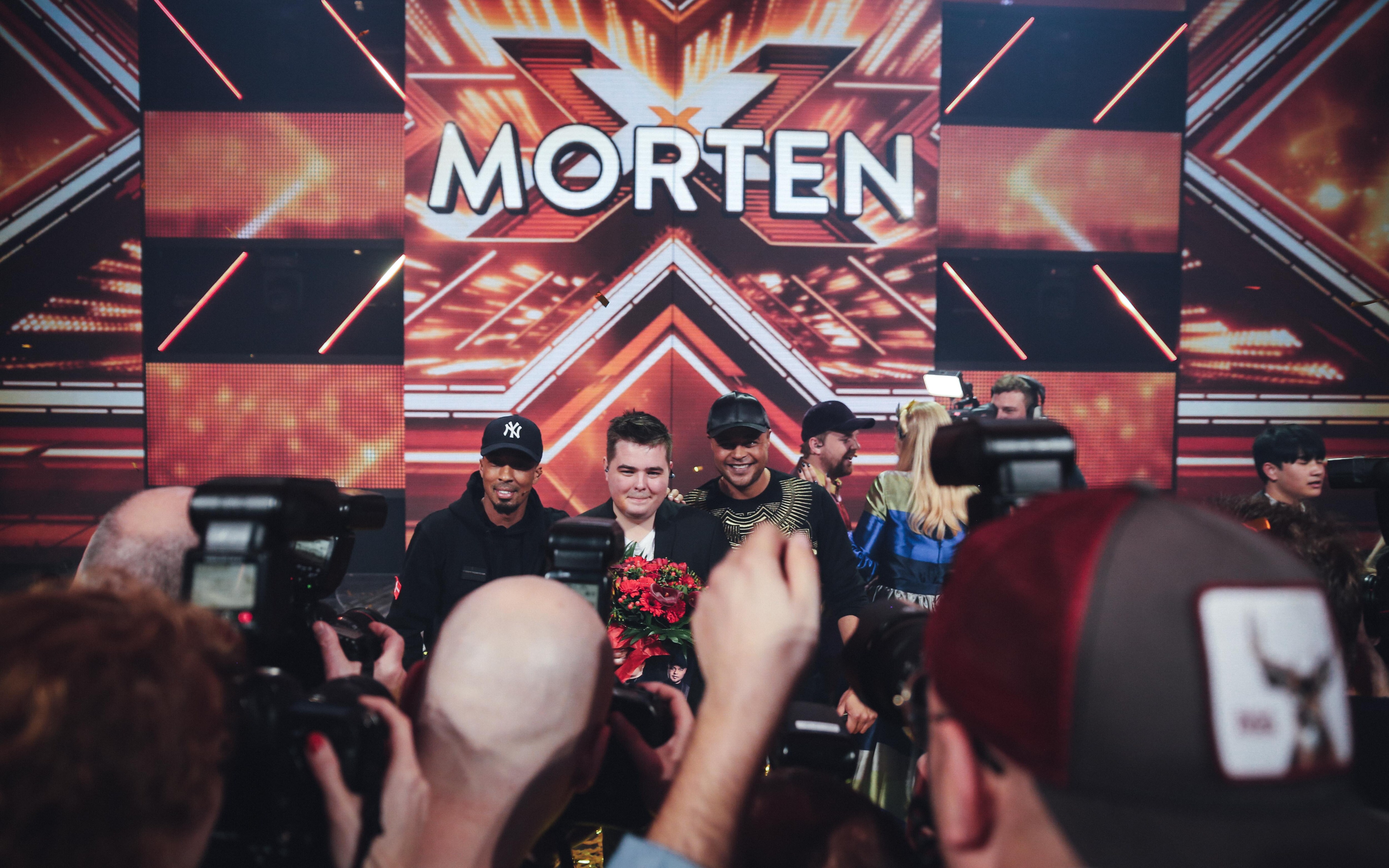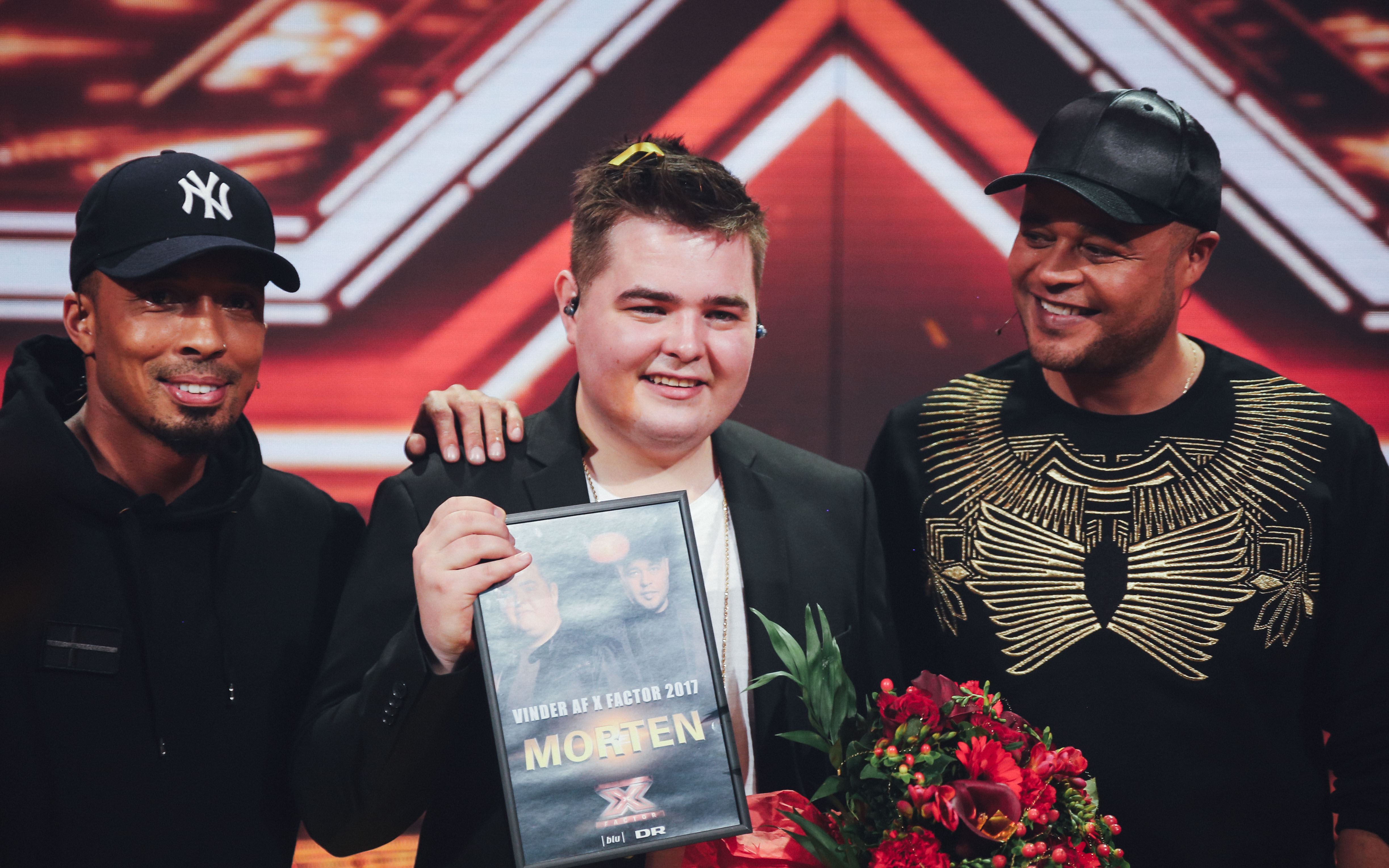 Vinderen af X Factor 2017, Morten Nørgaard, sammen med produceren Dallas Austin og sin mentor, Remee. (Foto: © Frederik Højfeldt, (c) DR)