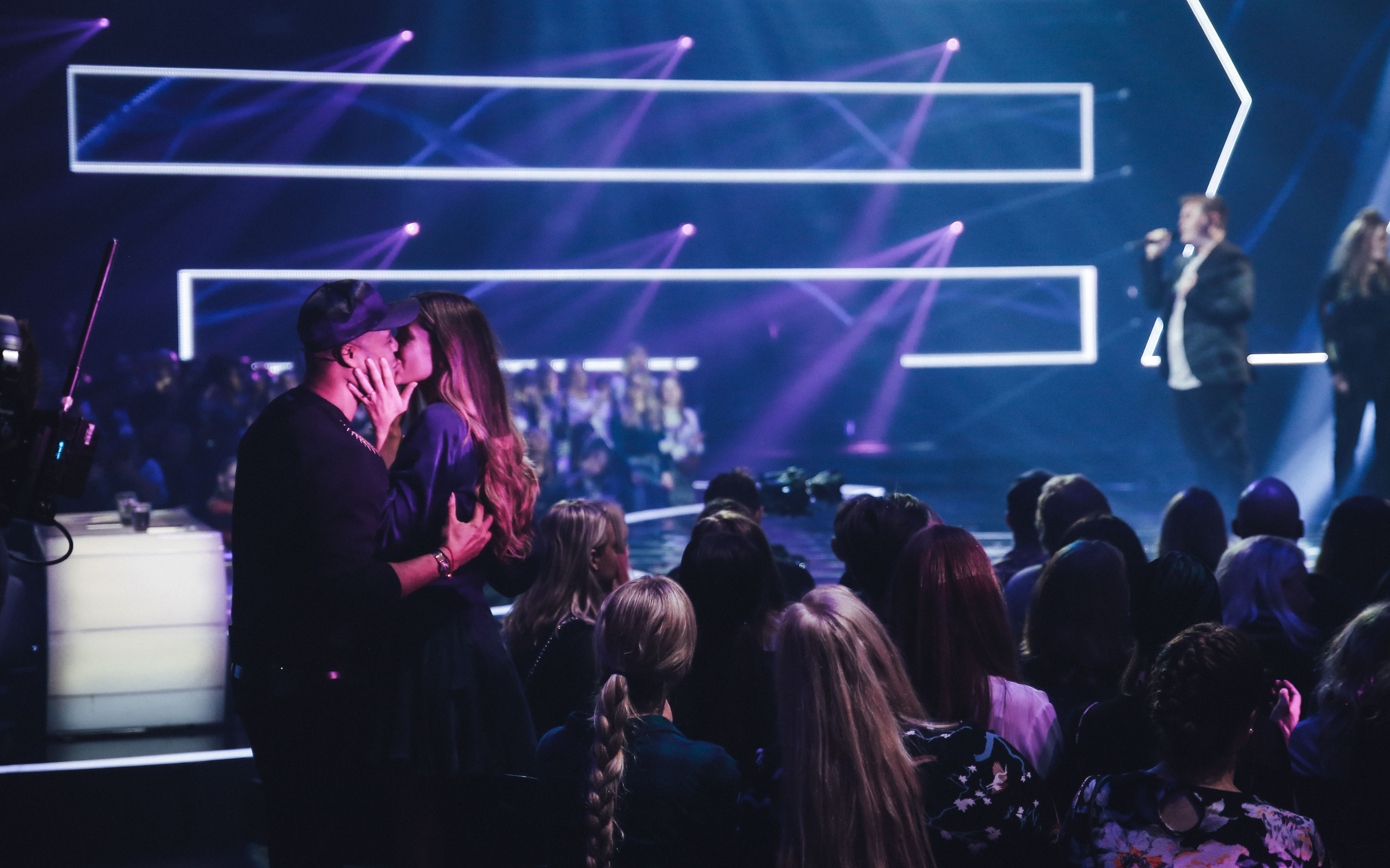 Remee kysser sin kæreste, Mathilde, efter Morten og hans sejr i X Factor. (Foto: © Frederik Højfeldt Nielsen, (c) DR)