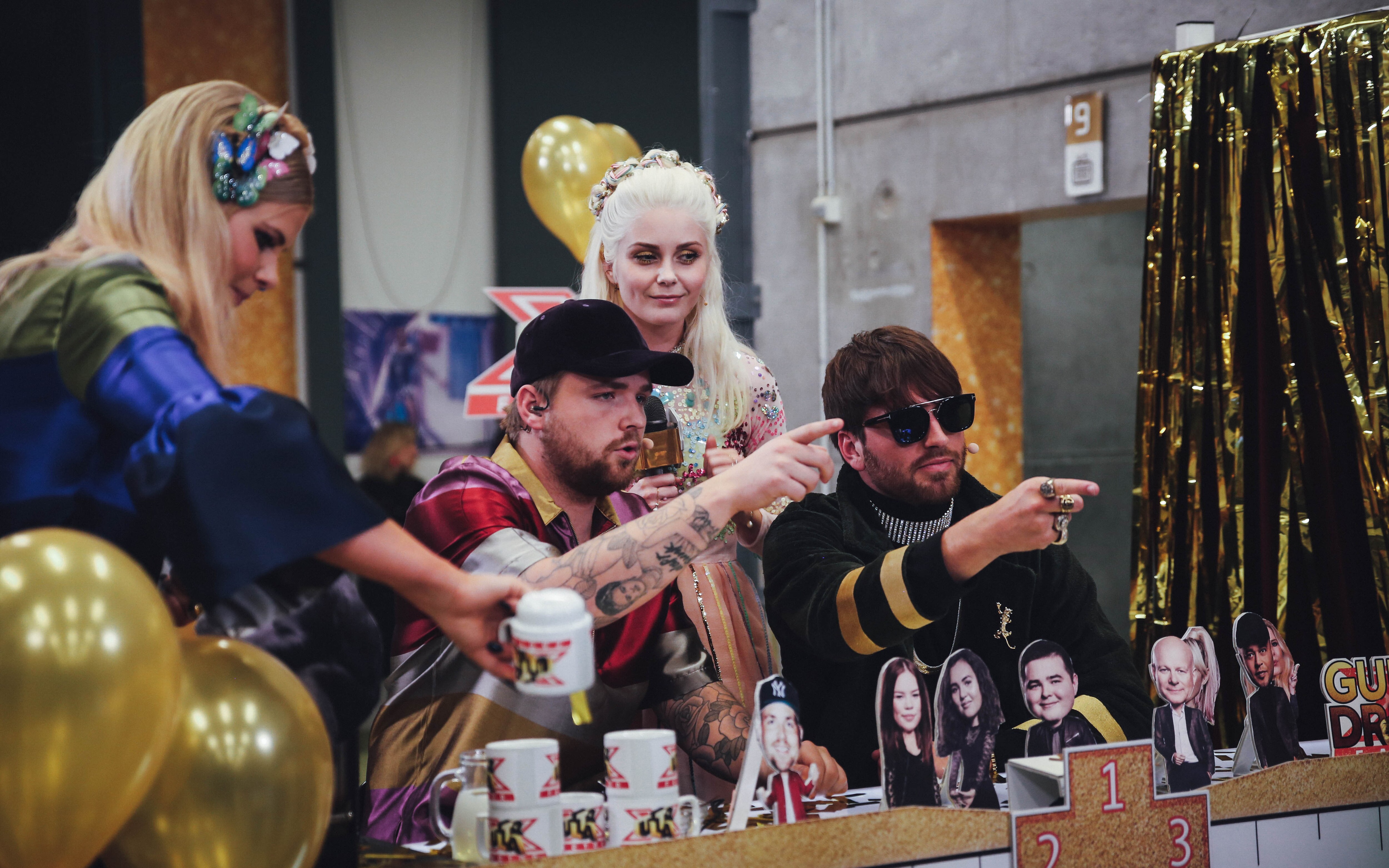 Ultra Factor havde besøg af Gulddreng, og Mette Lindberg og Sofie Linde kiggede også fordi Ultra Factor-studiet inden X Factors anden del. (Foto: © Frederik Højfeldt, (c) DR)