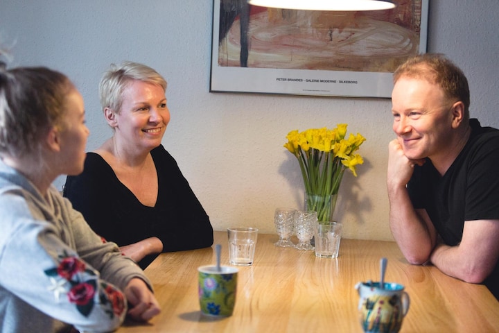 Anne Mette og Tomas deler husets mange kvadratmeter med deres to børn, 17-årige Sebastian og 14-årige Anna Simone. Husstanden tæller også fem høns, en kat og to tykke chinchillaer.