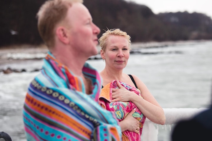 Der er ikke megen hyperventilation eller kuldechok at spore hos Anne Mette og Tomas, da de rammer det kolde vand. Det bliver endda til en lille svømmetur, inden de igen går i land.