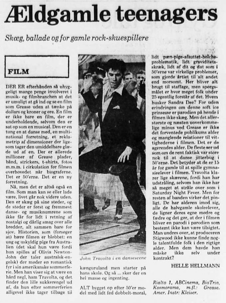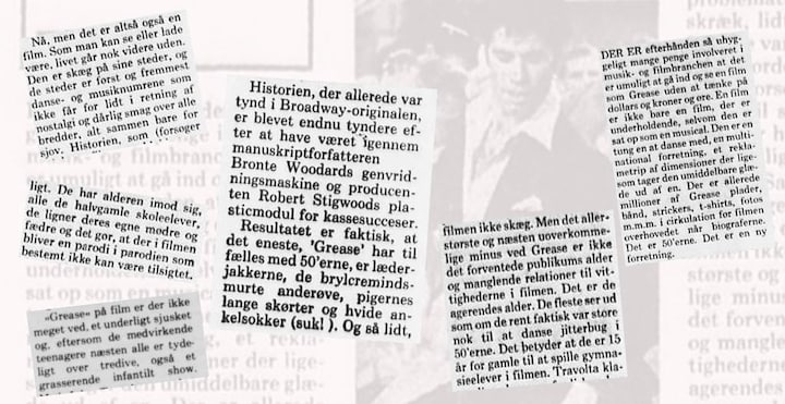 - Der er efterhånden så uhyggeligt mange penge involveret i musik- og filmbranchen, at det er umuligt at gå ind og se en film som Grease uden at tænke på dollars og kroner og ører, skrev hun og fortsatte sin anmeldelse: