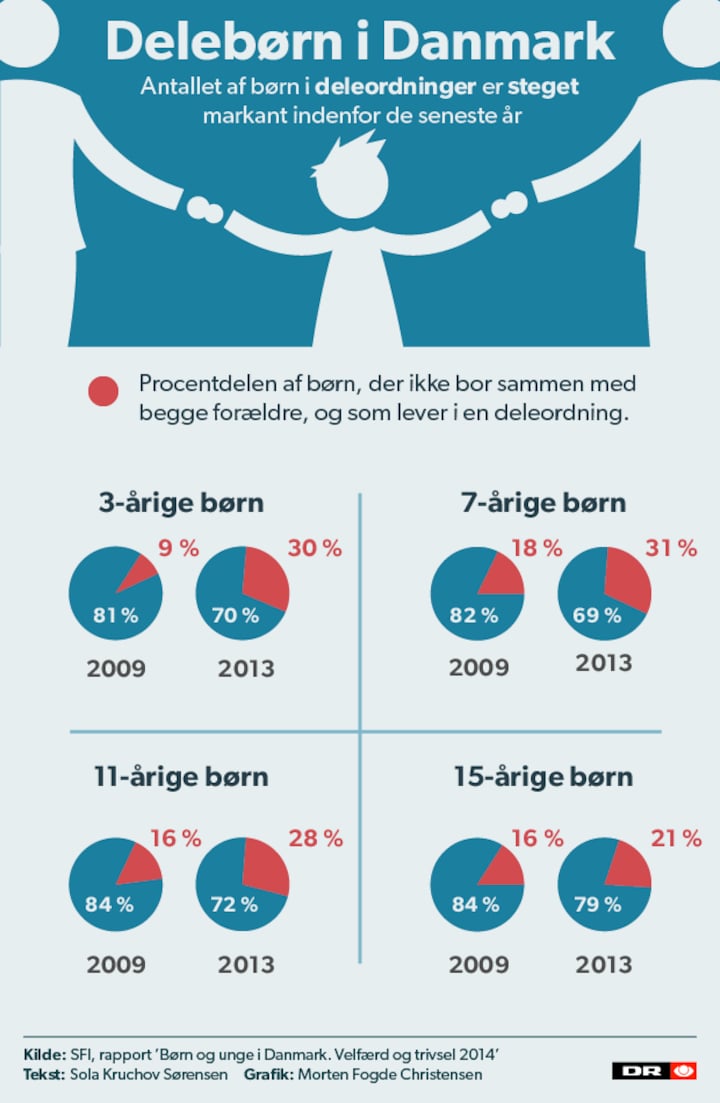 Blandt treårige børn, der ikke bor i en kernefamilie - altså ikke sammen med begge deres forældre - er andelen af børn i deleordning steget fra ni procent i 2009 til hele 30 procent i 2013.