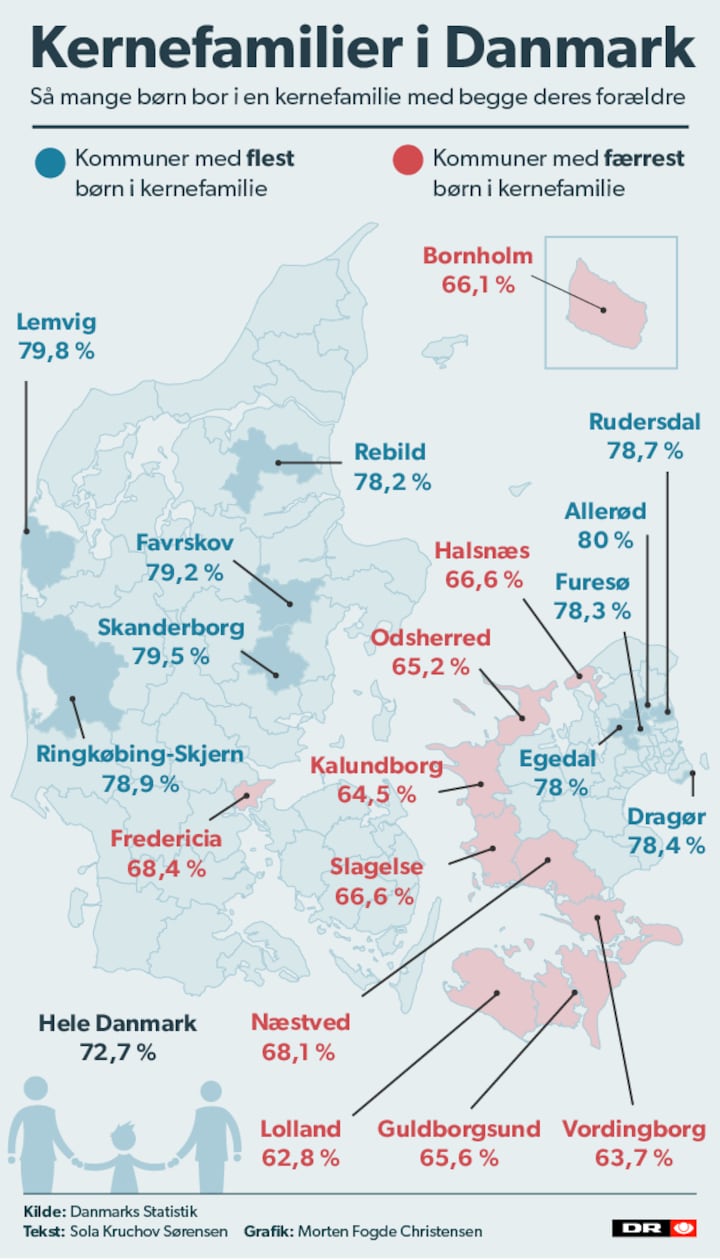 Se top ti over kommuner med flest børn i kernefamilier og top ti over færrest børn i kernefamilier i grafikken øverst i artiklen her.