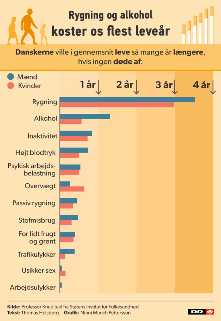 - Hvis man vil hæve vores middellevetid, så giver det ikke noget at sætte ind over for eksempelvis arbejdsulykker og usikker sex. Det er med alkohol og især rygning, at der vil være noget at hente i forhold til vores levetid, siger Knud Juel.