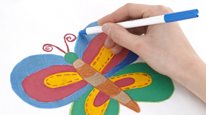 Det her er sikkert en øvelse, du udelukkende praktiserer sammen med dit barn: Grib farver eller tuscher og farvelæg en stregtegning i en malebog.