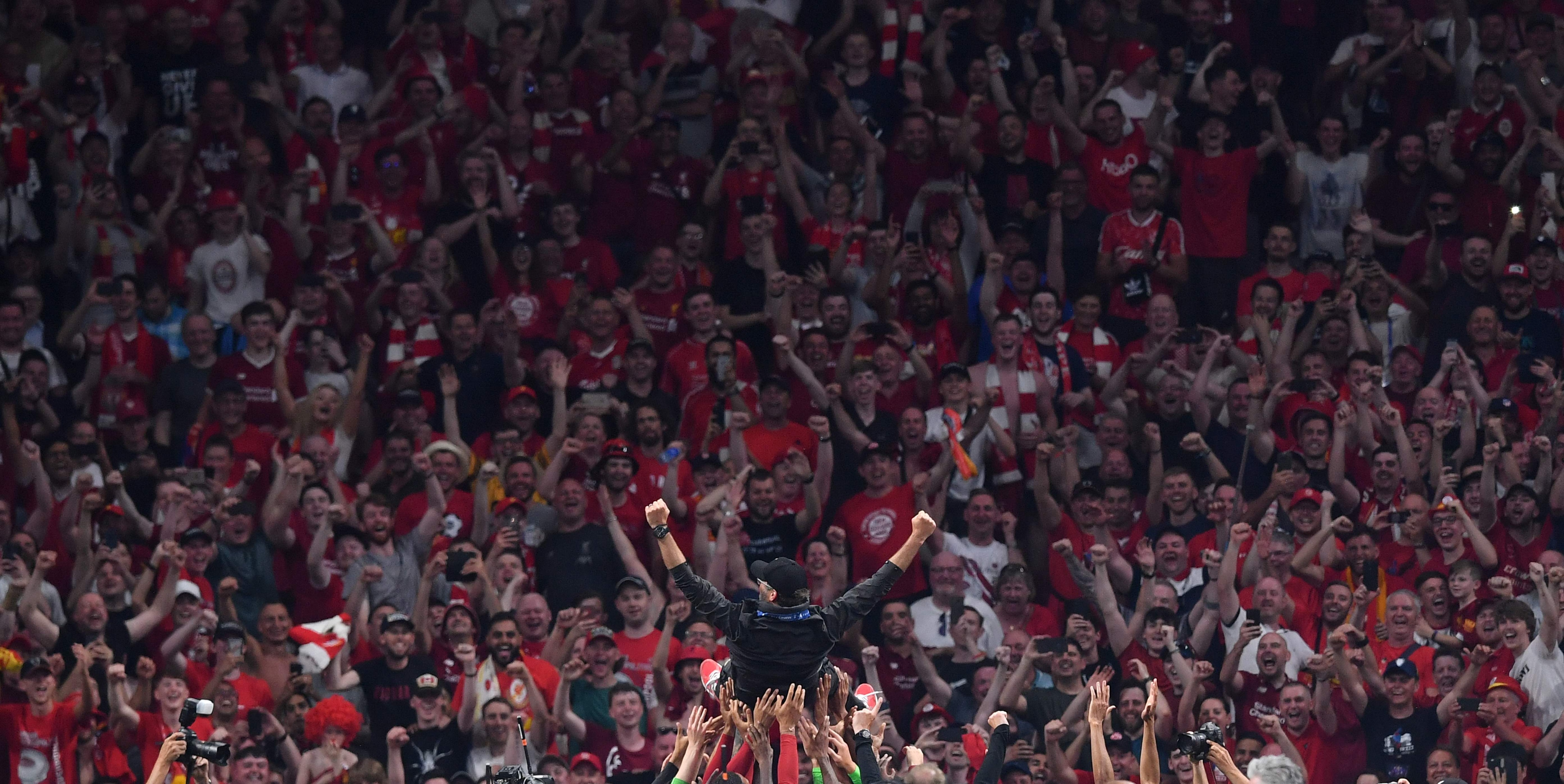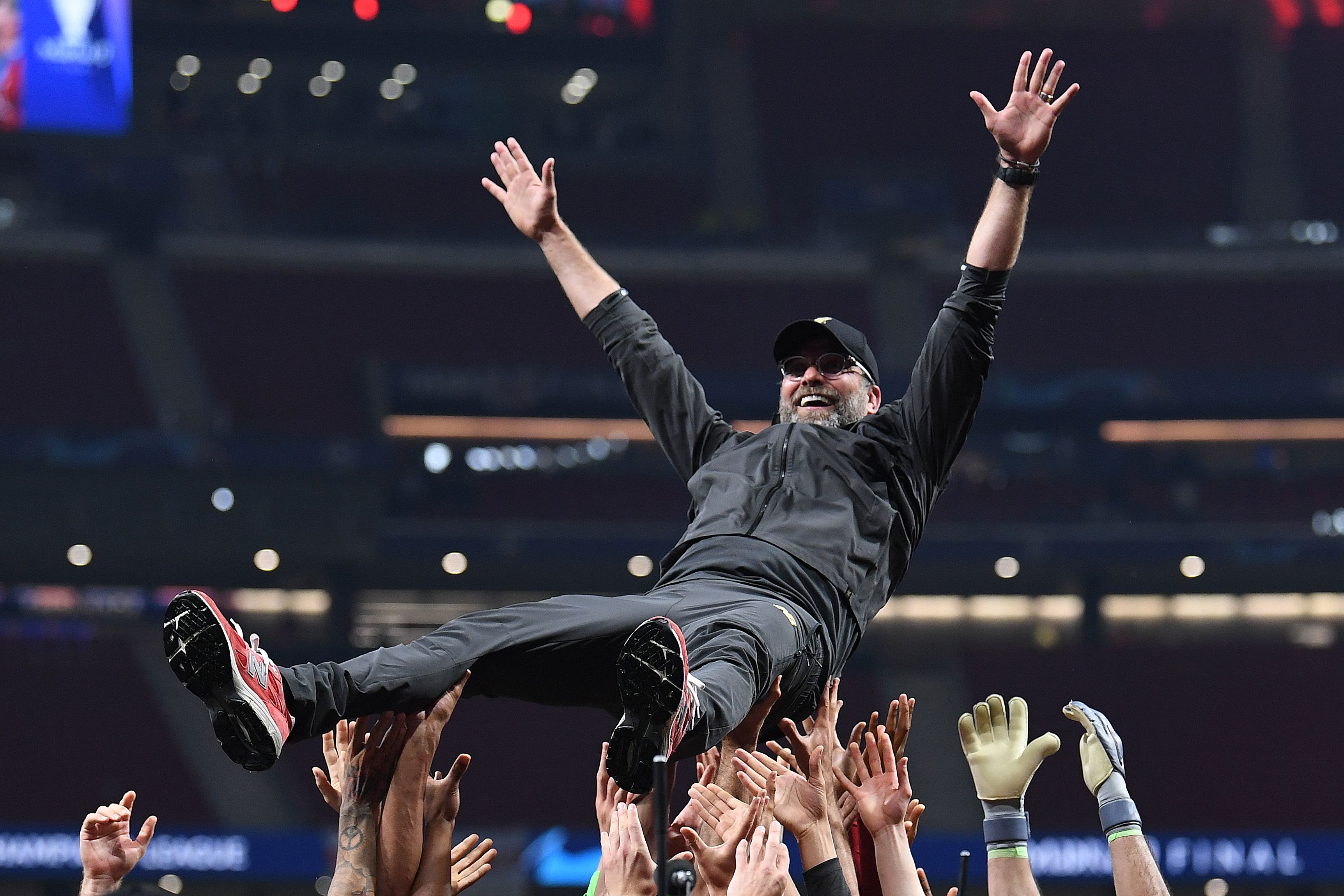 Liverpools tyske manager, Jürgen Klopp, blev løftet op i luften foran de mange fans. (Foto: © Paul ellis, Scanpix)