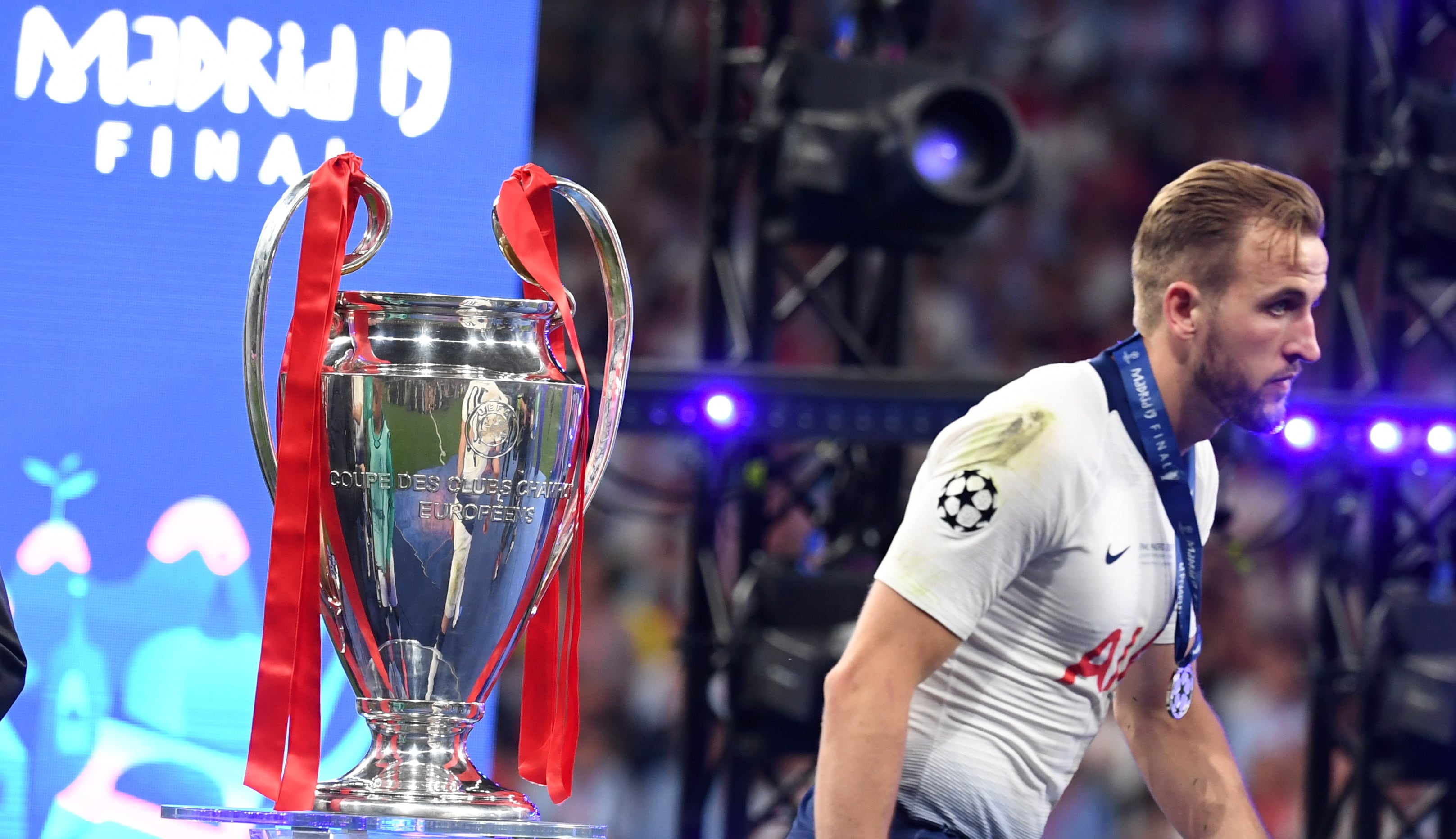 Tottenhams angriber, Harry Kane, går forbi pokalen, som Liverpool skal have. (Foto: © PETER POWELL, Scanpix)