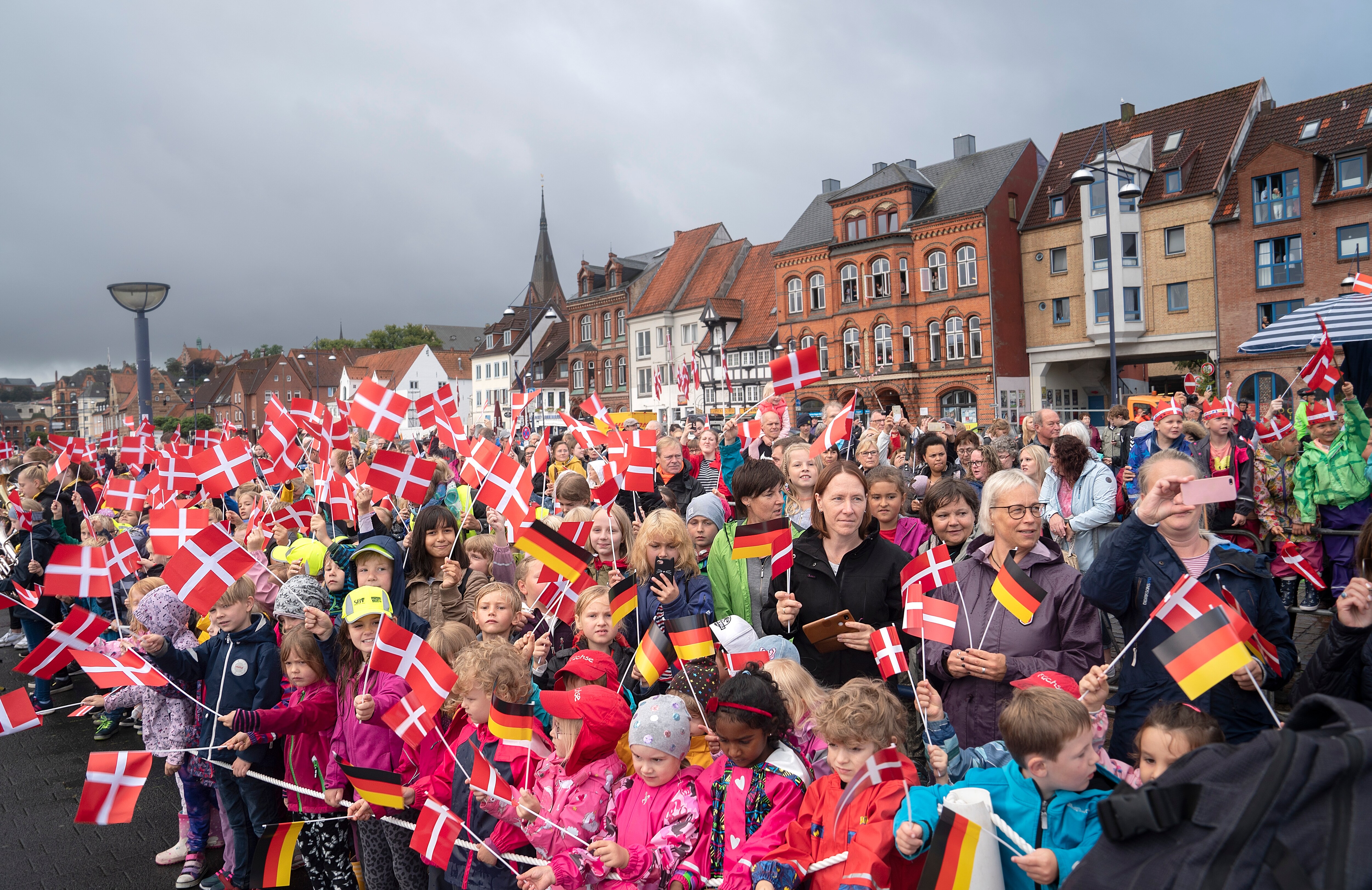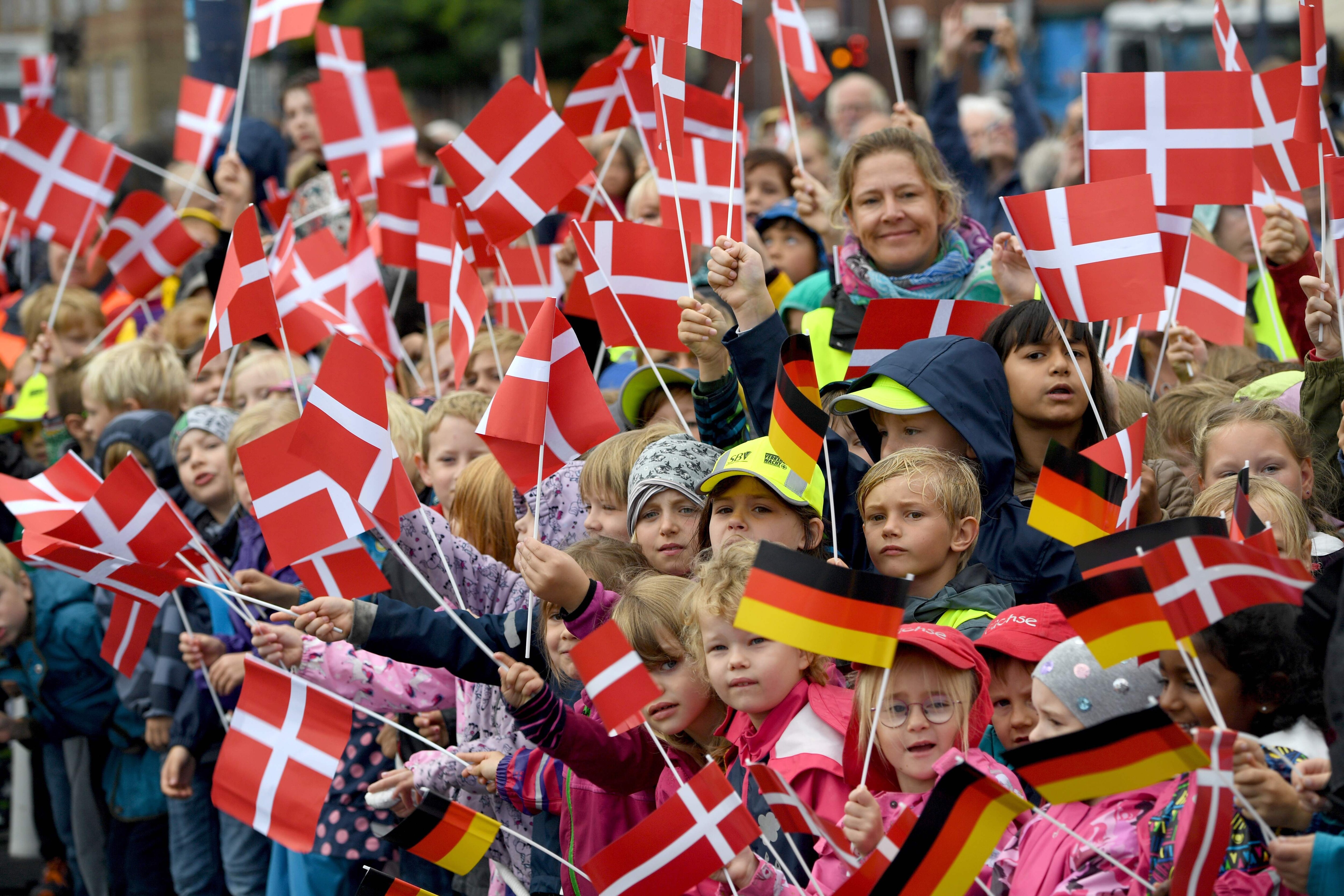 Men når dronning Margrethe denne gang bliver modtaget af sydslesvigerne, flager de flere steder både med Dannebrog og det tyske flag.