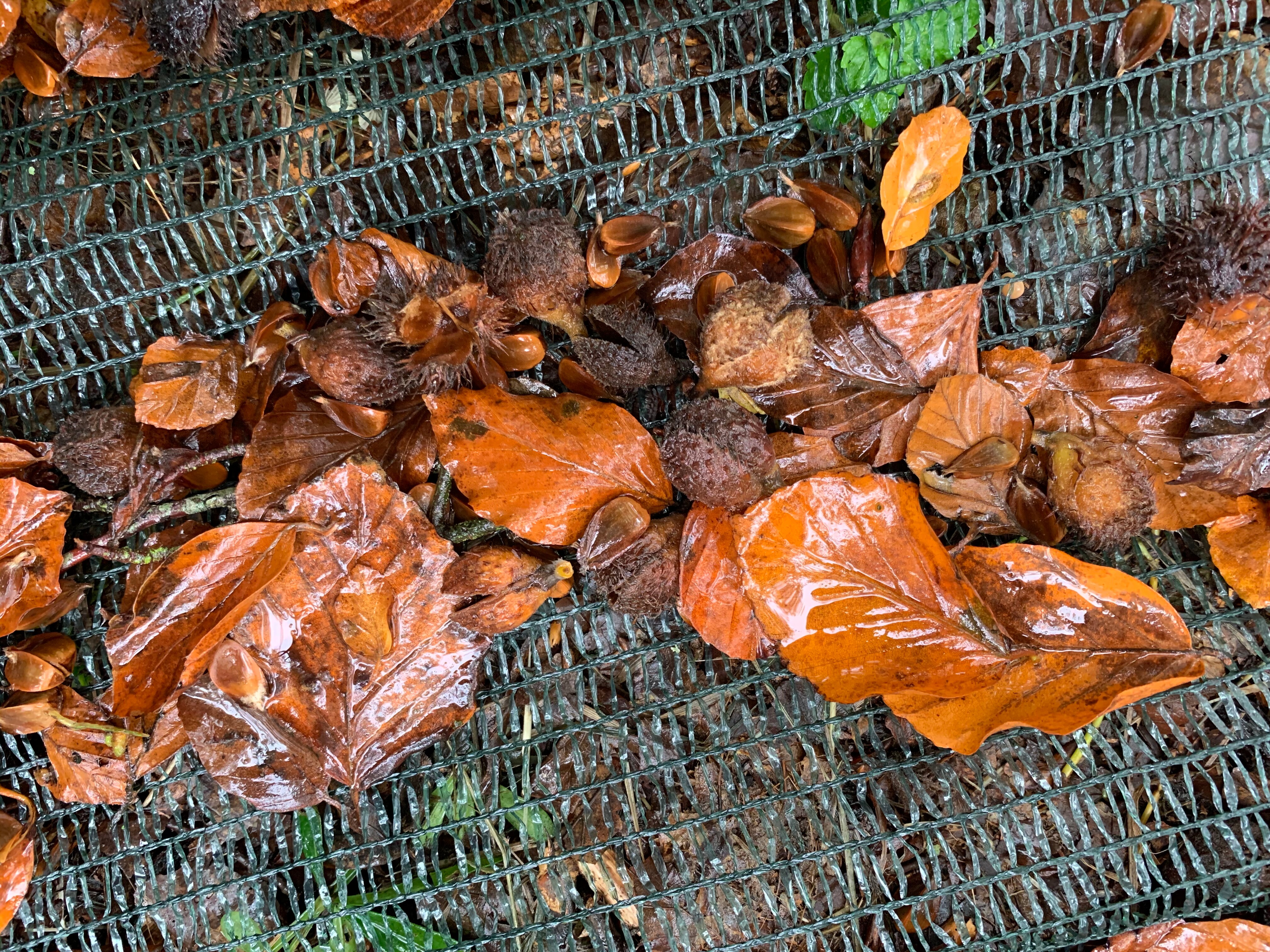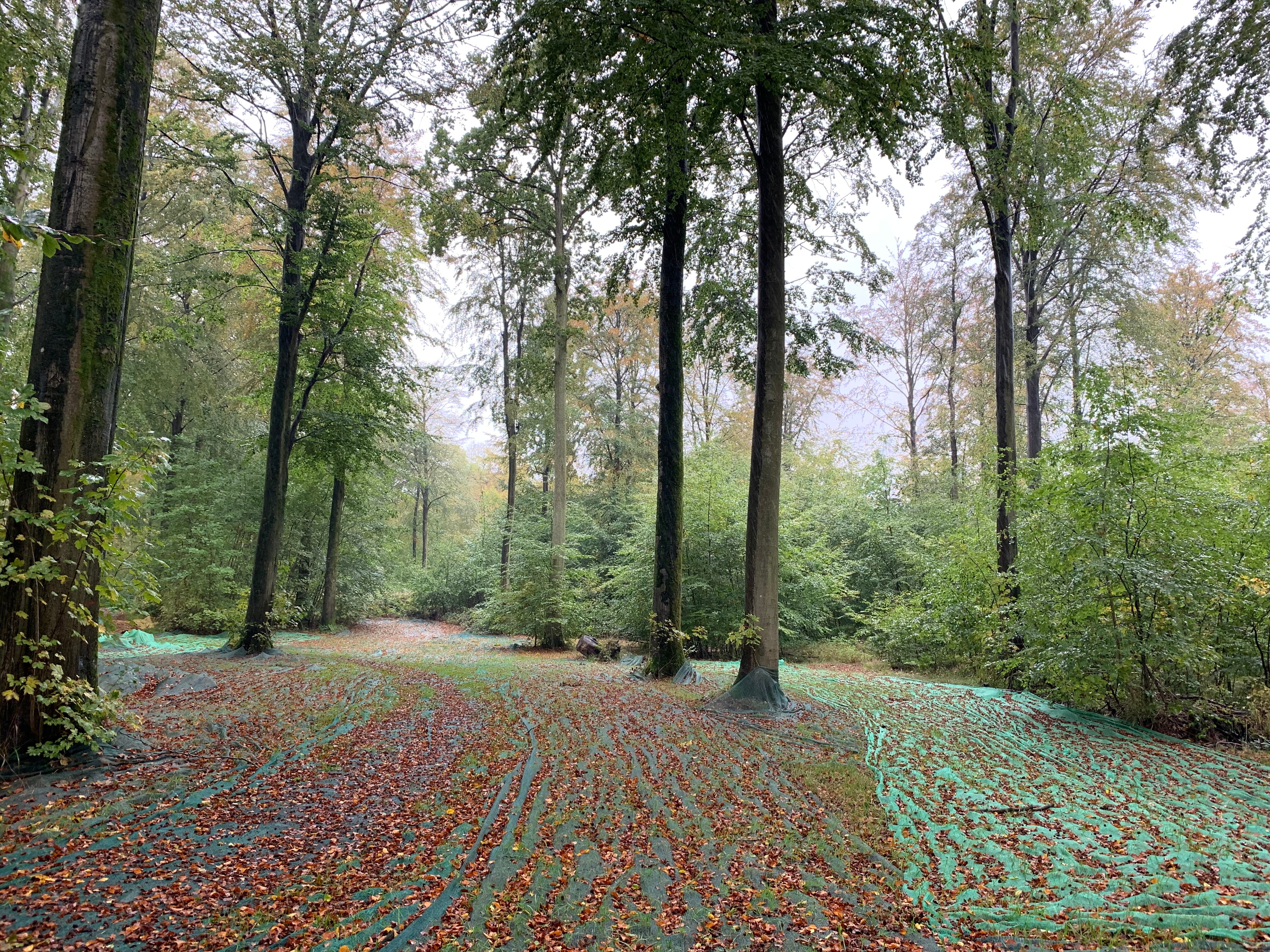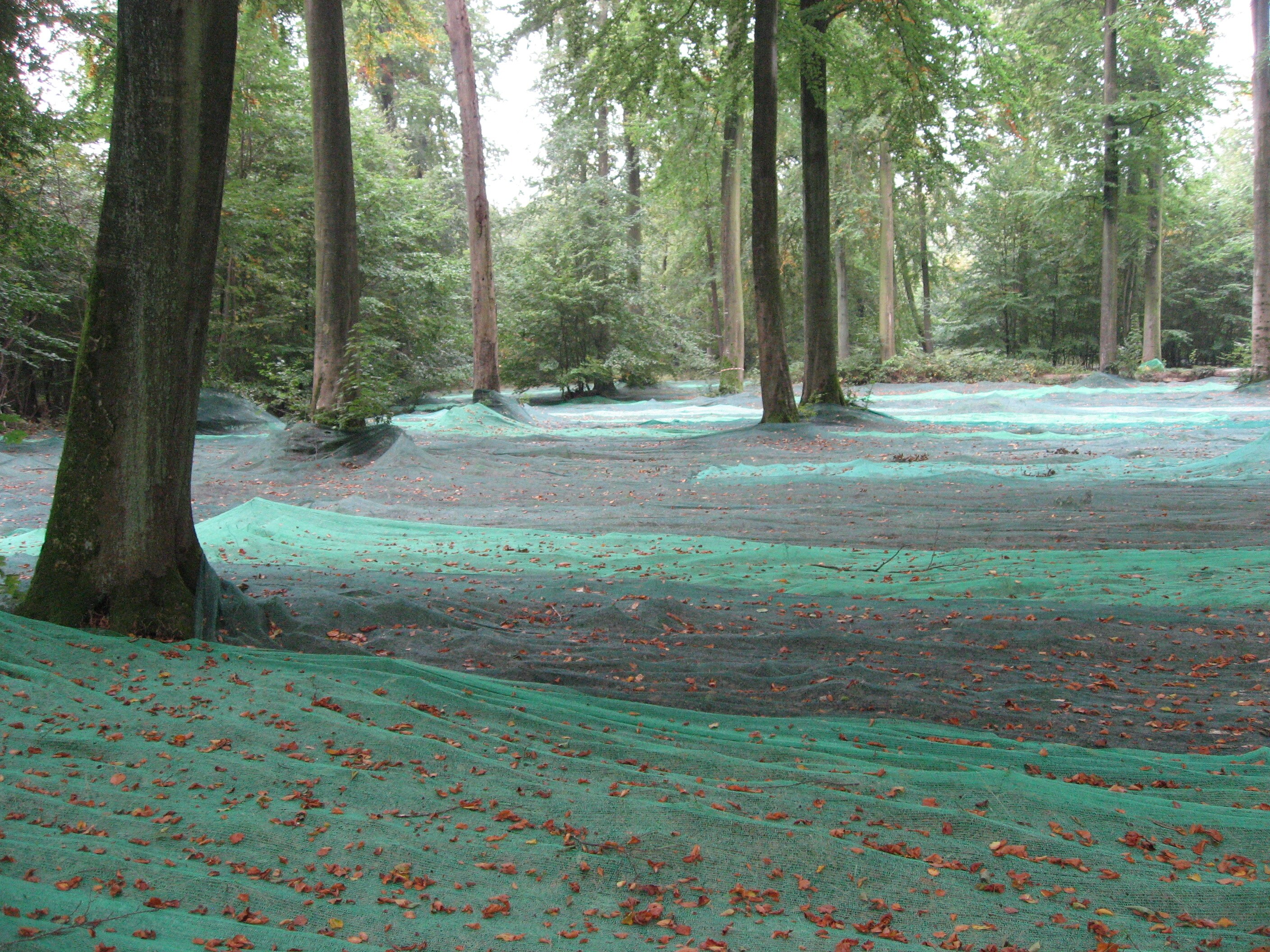 I skovbunden er der lagt et stort grønt net, der samler de nedfaldne ting op. Nettet dækker én hektar af skovbunden. Det svarer til næsten halvanden fodboldbane.