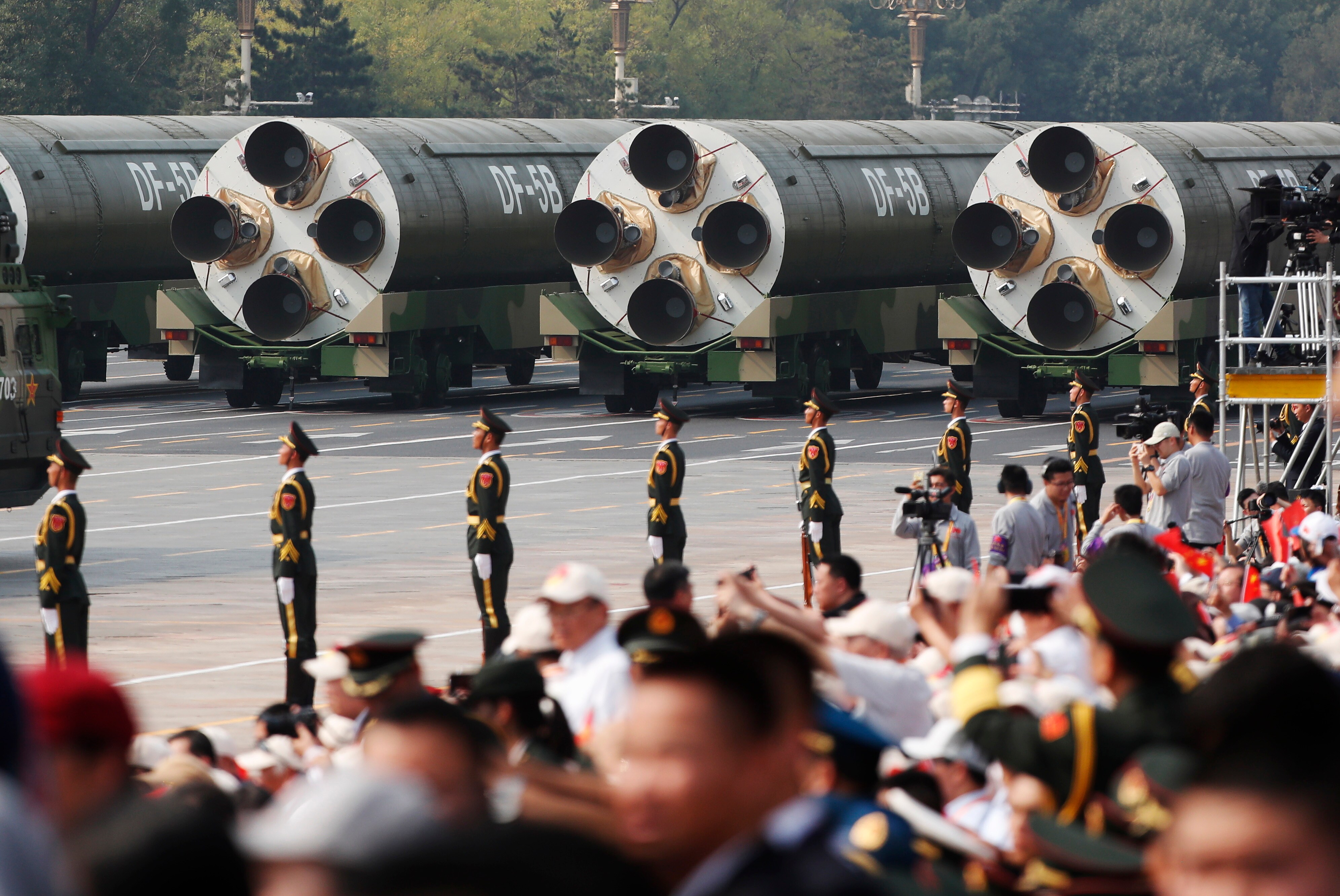 Her er det interkontinentale DF-41-missiler, der ruller henover Den Himmelske Freds Plads i Beijing. (Foto: © JASON LEE, Scanpix)