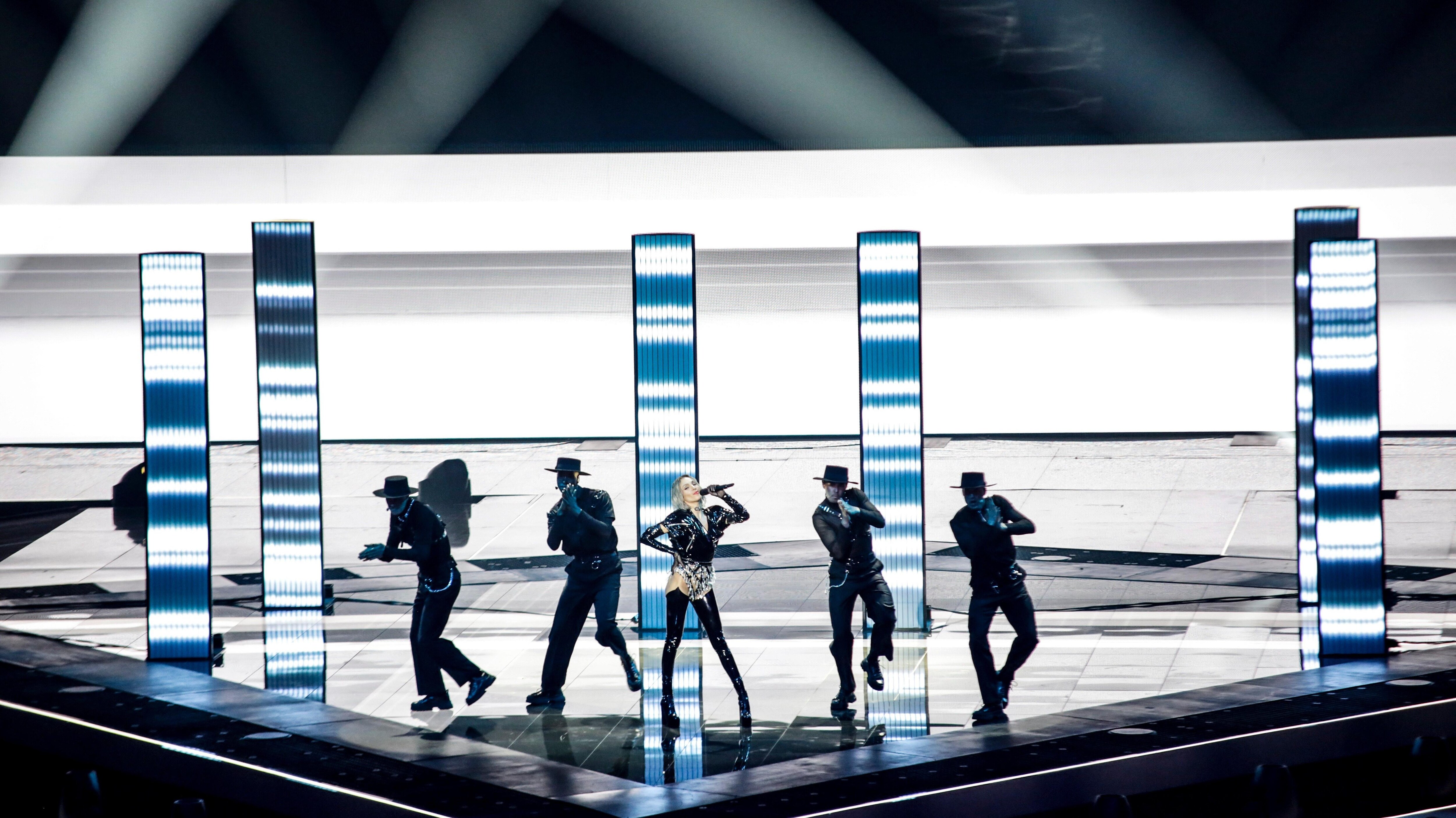 Så er vi ligesom i gang. Sidste års vinder, Netta, åbner semifinalen med masser af dansere og fuld smæk på fyrværkeriet. (Foto: © Abir sultan, Scanpix)