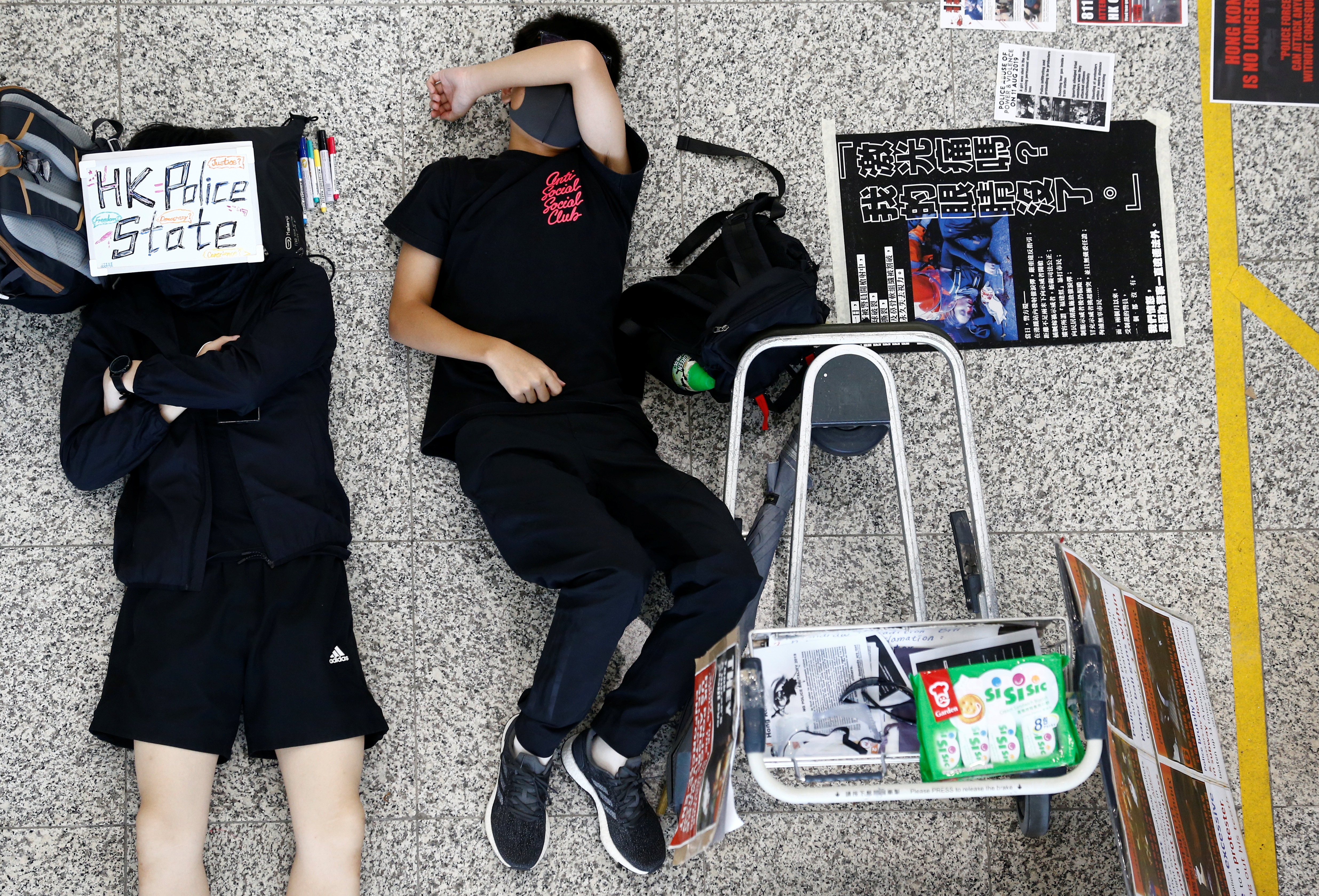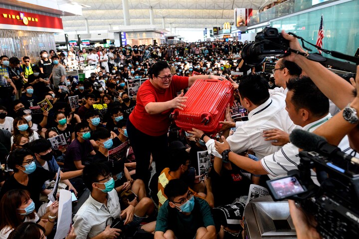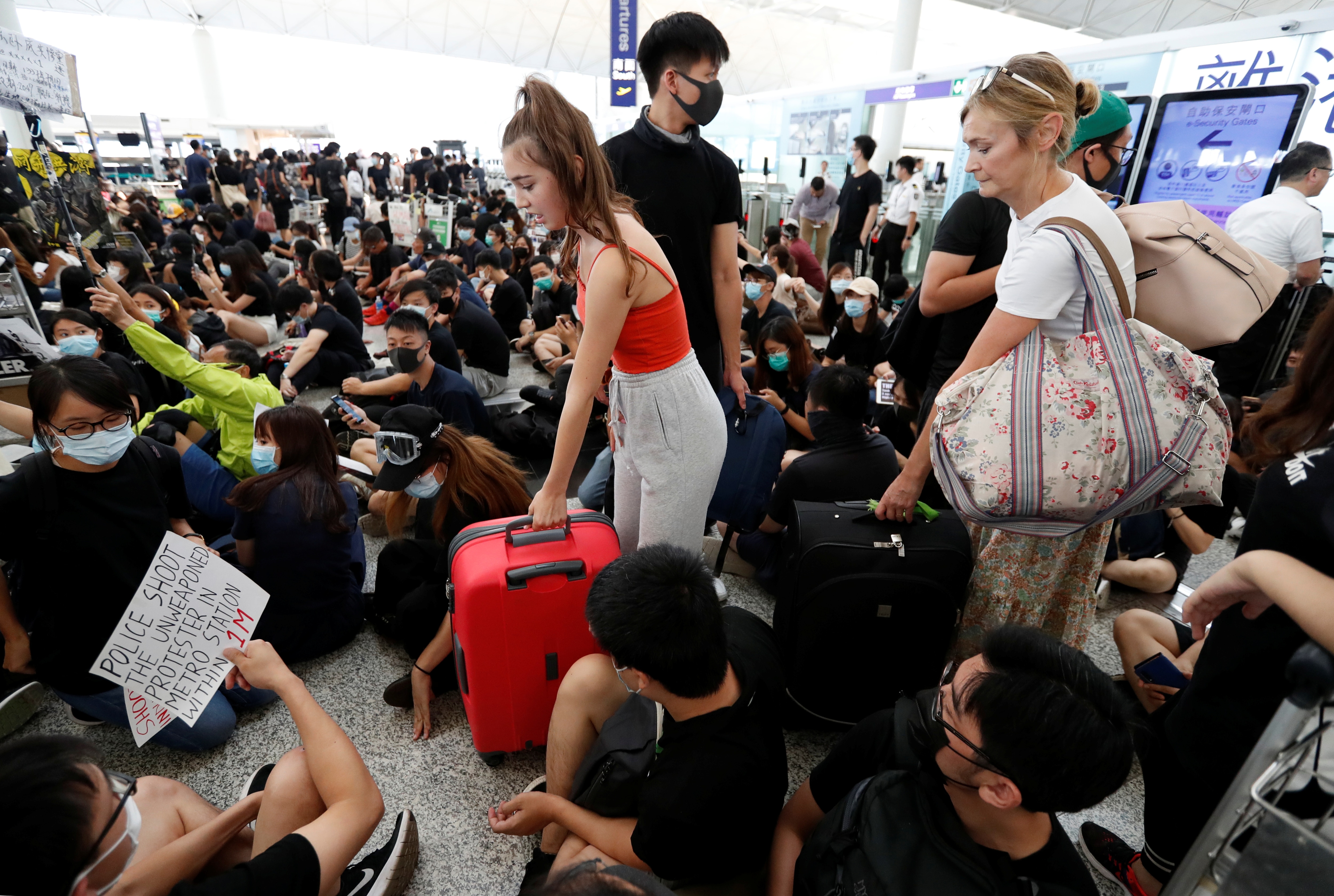 Demonstranterne er klædt i sort tøj, og de råber "Støt Hongkong, støt friheden", mens passagerer triller deres kufferter forbi demonstrationerne.