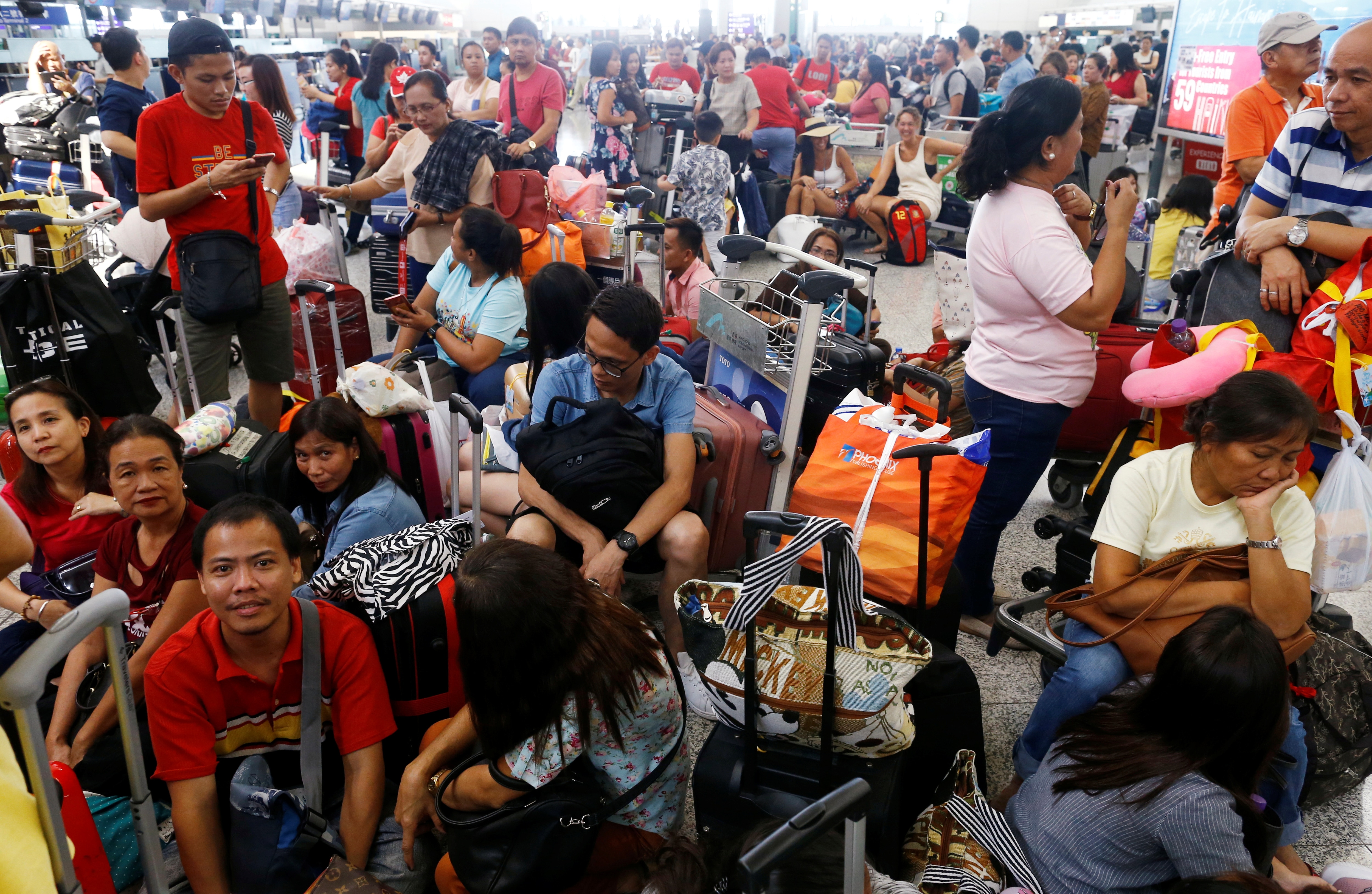 Demonstranterne bruger bagagevogne til at blokere adgangen til check-in-skrankerne, og de råber slagord mod regeringen.