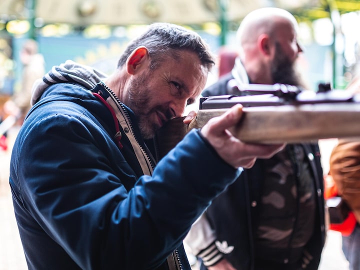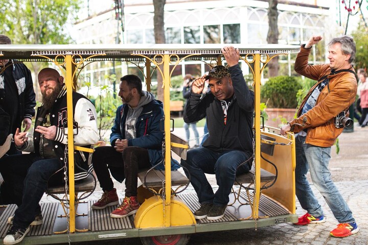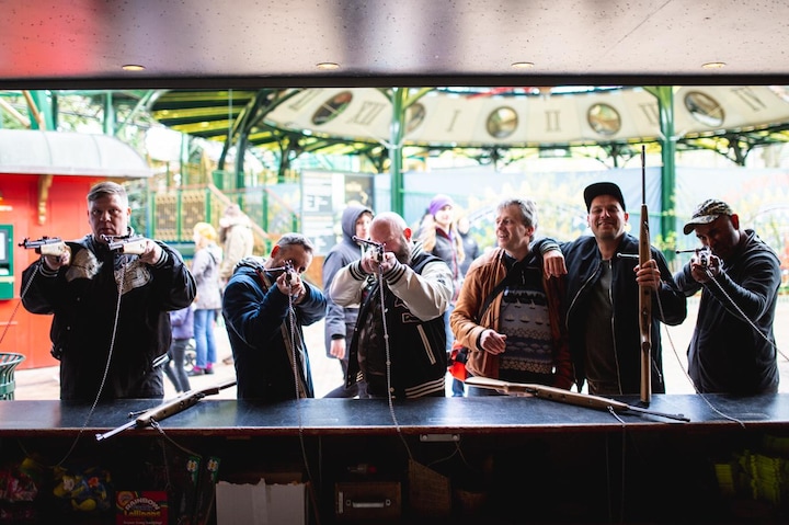 Mens vi slentret rundt i forlystelsesparken misser de seks modne mænd ikke en chance til at stikke til hinanden.
