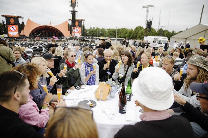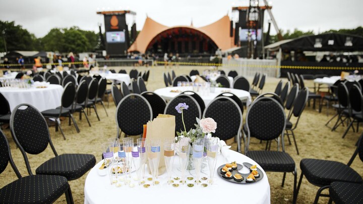 På festivalpladsen står der runde borde med hvide duge omringet af bløde, sorte stole, som man kender fra bryllupper og andre festlige begivenheder.