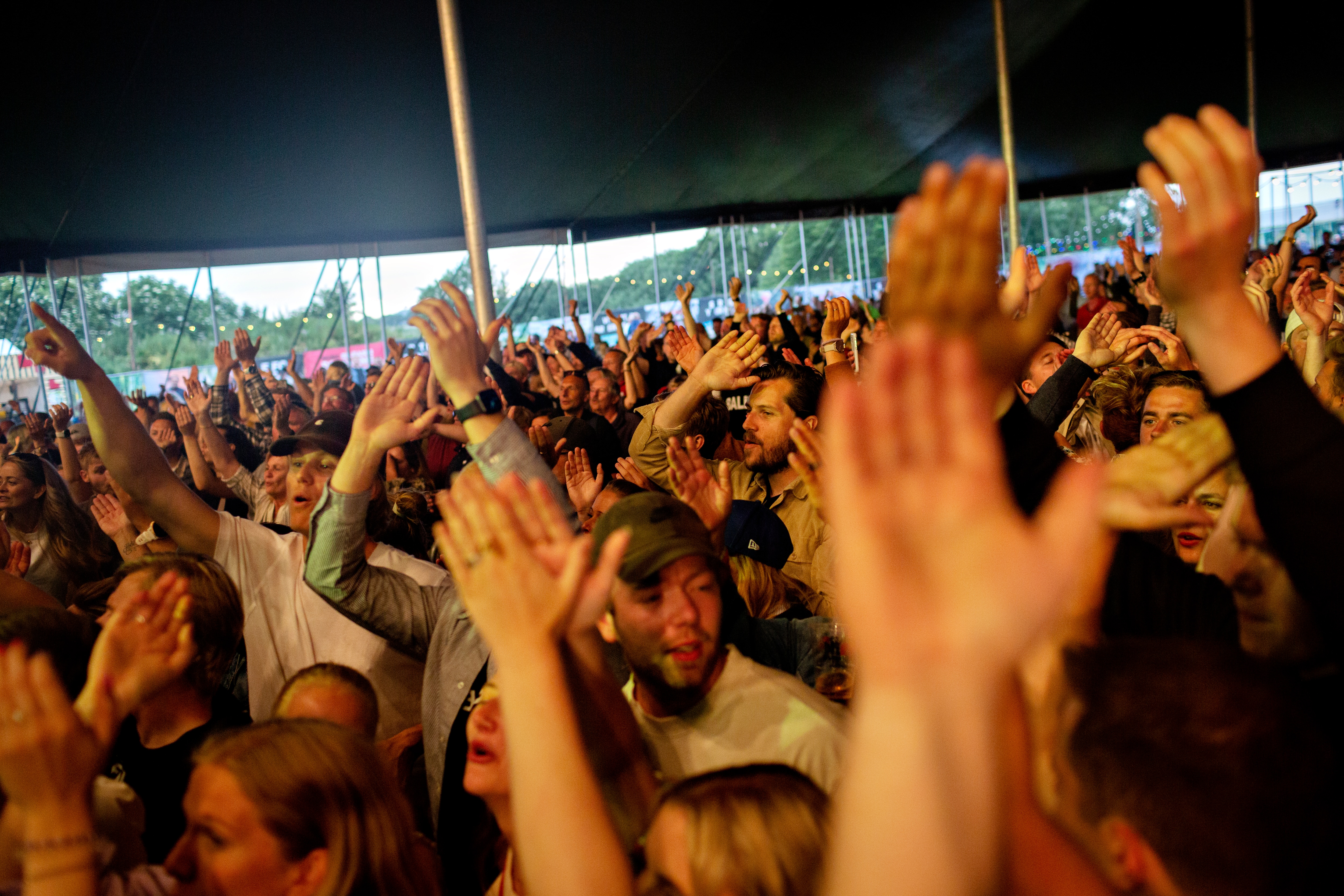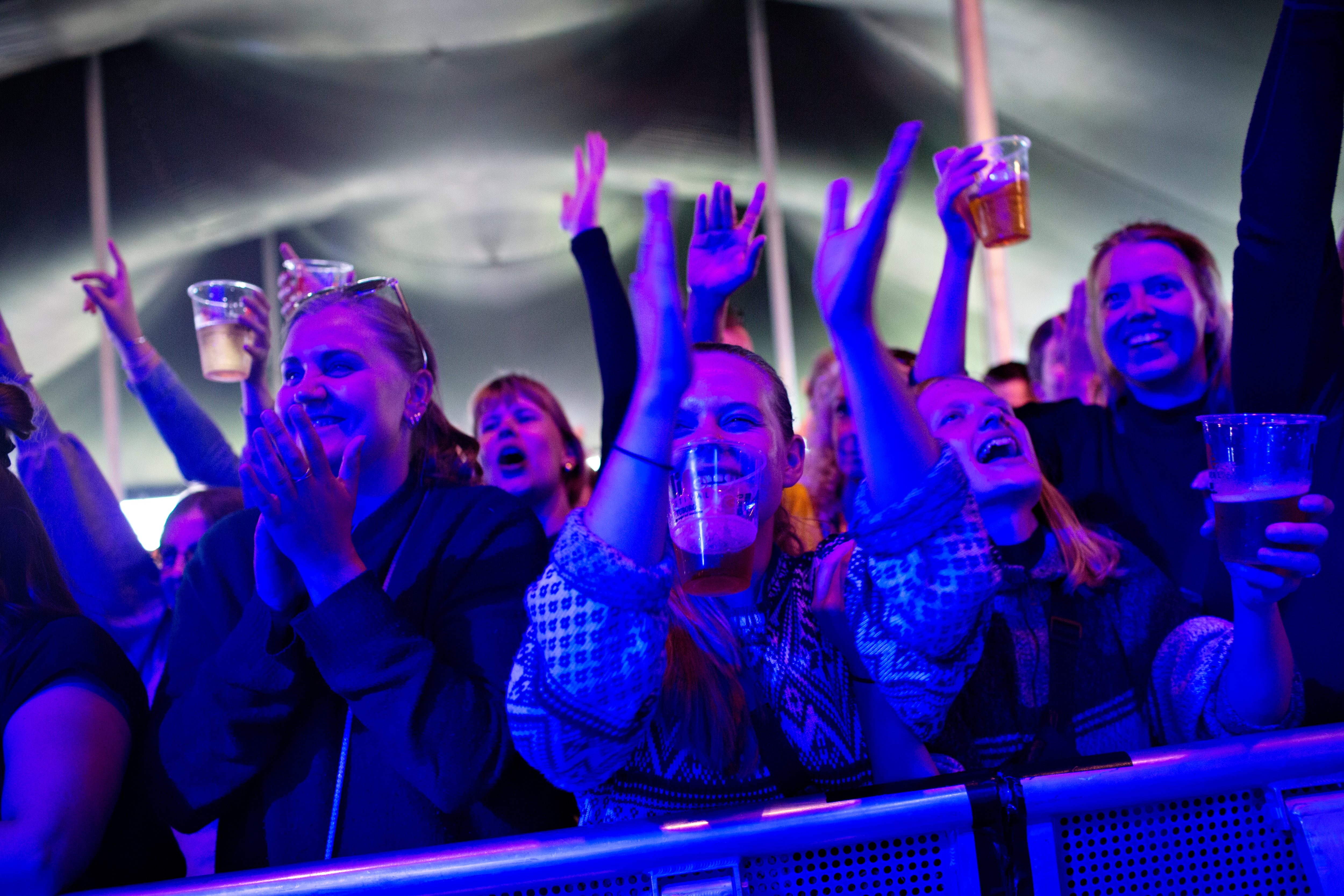 Publikum kvitterede med at fylde teltet med ægte festivalstemning trods de coronavenlige forhold. Her blev der både brølet, skrålet og klappet igennem af trioen, som til lejligheden havde medbragt en trommeslager.