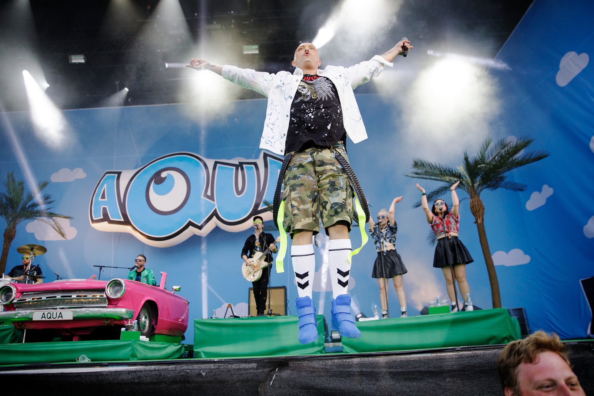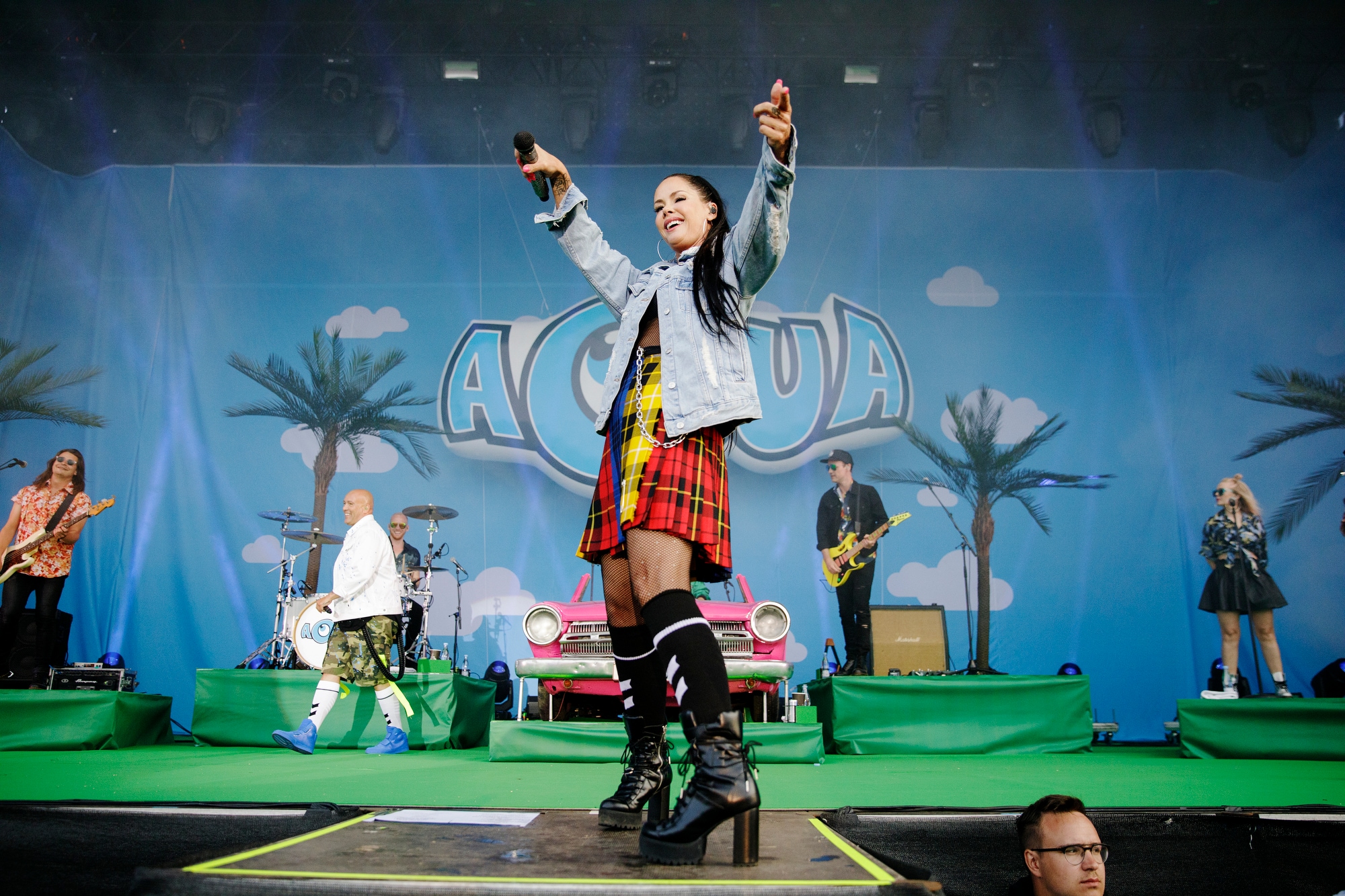 Søren Rasted og hans keyboard er blevet placeret i en skrigpink Cadillac-kopi, mens scenen fremstår som et sandt inferno af plastic-palmer, kunstgræs og blå tegnserie-himmel. Prikken over i'et er et enormt oppusteligt Aqua-logo.