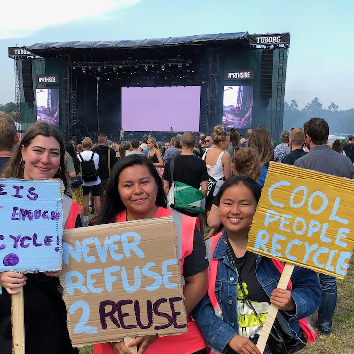 Bevæbnet med 'cool people recycle'-bannere af genbrugspap - selvfølgelig - går de rundt blandt publikum og samler skrald samtidig med, at de opfordrer folk til at rydde op efter sig selv.