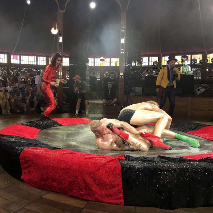 Det var nemlig såkaldt Glitter Wrestling, hvor de to modstandere kun var iklædt underbukser og sukker - og en ordentlig omgang olie og glitter.
