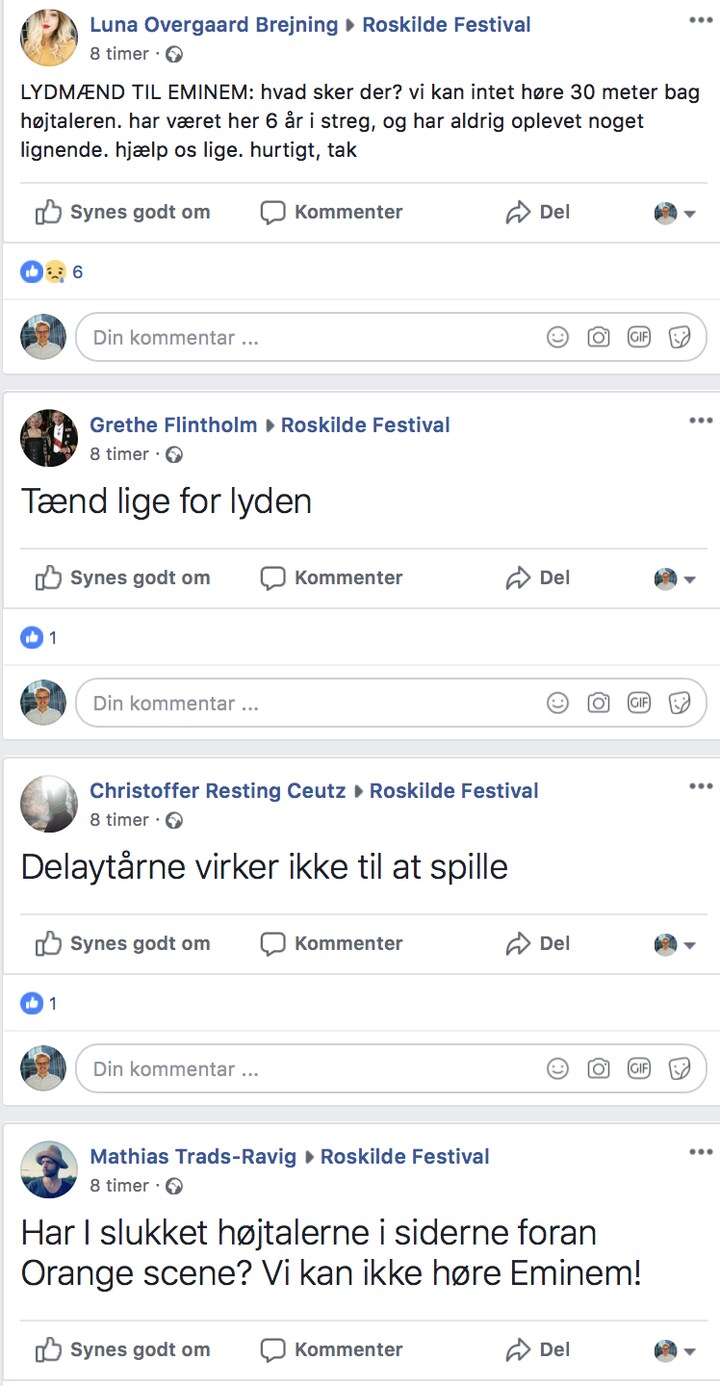 - Ville være mega fedt, hvis I tændte de bagerste højtalere til næste koncert på Orange. I har også kun prøvet at få Eminem i 20 år, skriver Mikkel Grevy til Roskilde Festival på Facebook.