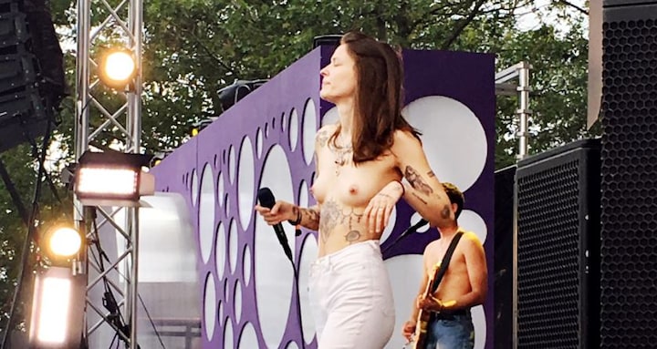 Foran de omkring tusind tilskuere, som var kommet for at høre hendes personlige sange, som er en blanding af harpe, cello og R&B, smed hun og fire andre bandmedlemmer pludselig trøjerne, så de stod i helt bar overkrop.