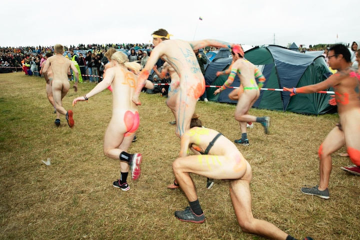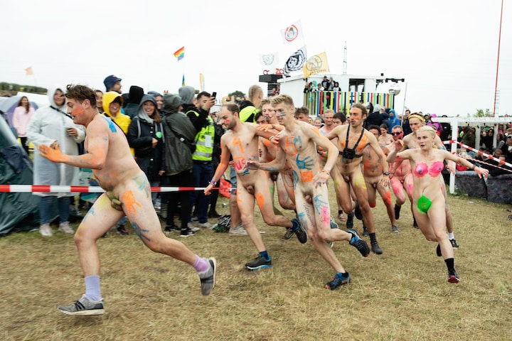 For bedst som folk begyndte at stimle sammen i festivalens Dream City-område, hvorfra nøgenløbet afvikles, åbnede himlen sig over de 15 mænd og ti kvinder, der skulle tage del i dette års nøgenløb.