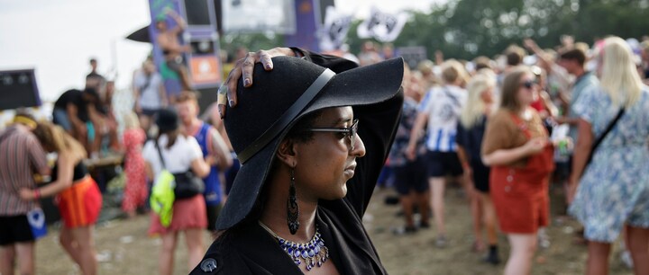 Nu møder vi hende her i år på samme område på festivalen. Hun er ikke svær at få øje på i mængden af tusinder af festivalgæster. Graciøst kommer hun gående mellem teltene på campingområdet iført en stor sort hat, bling om halsen og et glimt af en rød BH under den sorte trenchcoat. Hun ved, hun skiller sig ud, uanset hvad hun har på, så som hun siger ’fuck it, jeg kan lige så godt gå hele vejen’.