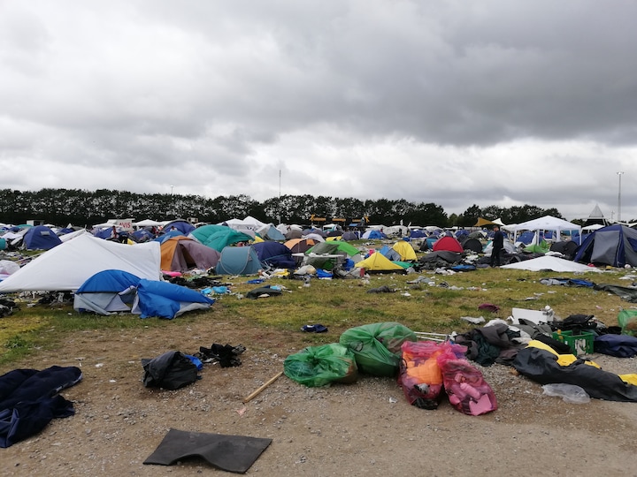 Det bugnede af soveposer, telte, liggeunderlag, madaffald, flasker og hvad man ellers kan forestille sig, efter at tusindvis af mennesker har været samlet til en musikfestival i en uge.