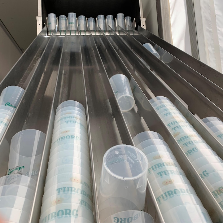 Her vaskes og tørres godt 9.000 krus i timen, inden de sendes tilbage til barerne. Og det sparer altså festivalerne, men også miljøet, for godt to millioner engangskrus, som Tuborg ellers ville have skullet producere i løbet af årets festivalsæson.