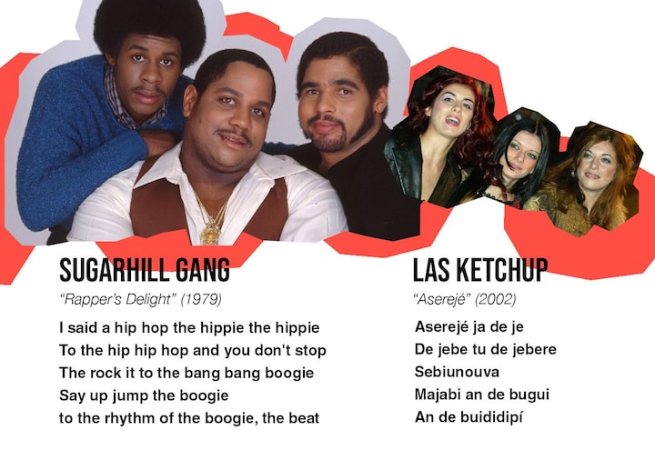 Jep, omkvædet i 'The Ketchup Song (Aserejé)' er faktisk en dårlig spanglish udgave af teksten fra 'Rapper's Delight'.