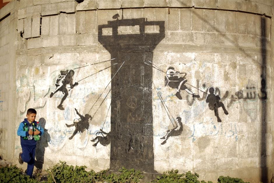 Sammen med billederne af malerierne har den britiske kunstner lagt en Israel-kritisk video op, hvor han angiveligt bliver smuglet ind i Gaza for at filme ødelæggelserne.
