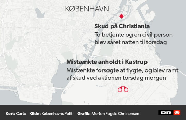 En anholdelse på Christiania udviklede sig onsdag aften dramatisk, da en mand trak et våben og beskød to betjente og en civil.
