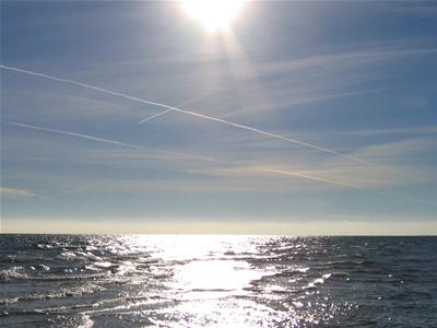 Et billede af solen, dens stråler og havet fotograferet fra toppen af Skagens gren over Kattegat, med Frederikshavn ude til højre (Foto: © Benedicte Coulthard)