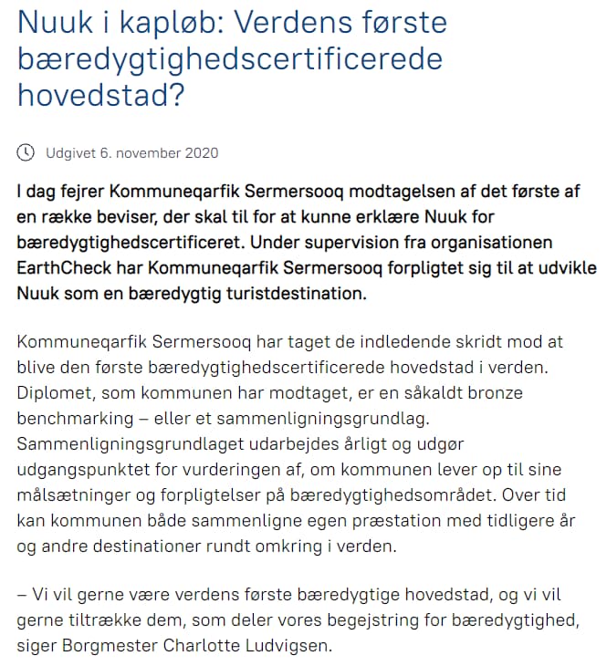 EarthCheck skriver også selv på deres hjemmeside, at "Nuuk bliver den første bæredygtige hovedstad i verden."