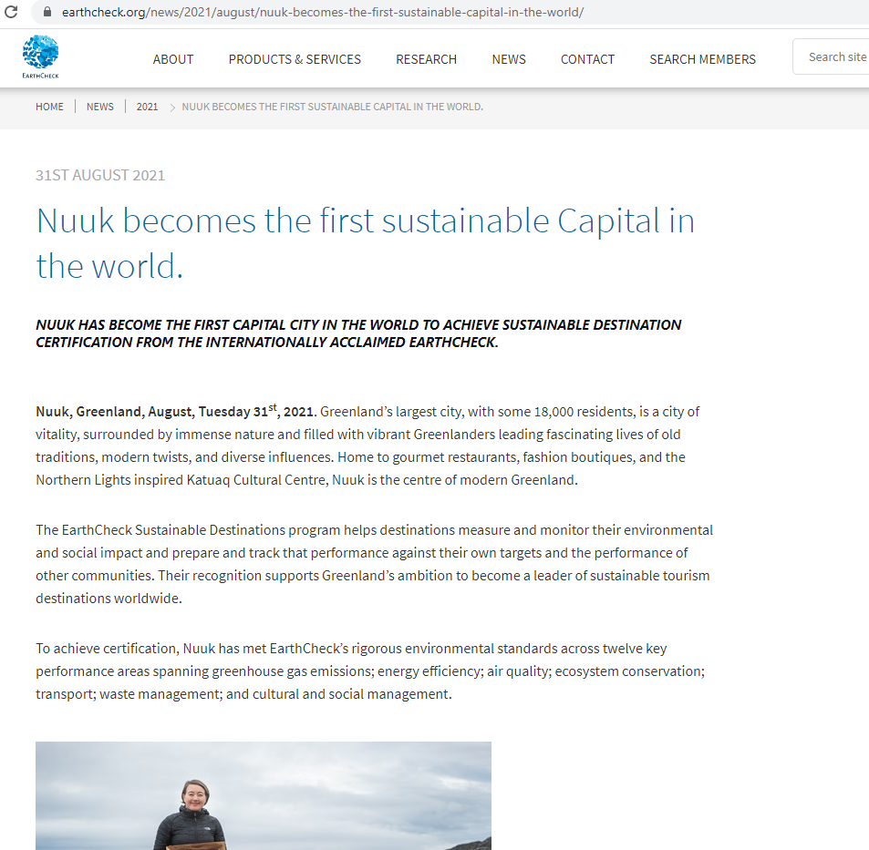På kommunens hjemmeside kunne man læse, at "Nuuk har slået alle andre hovedstæder i verden, når der måles på bæredygtig turisme."