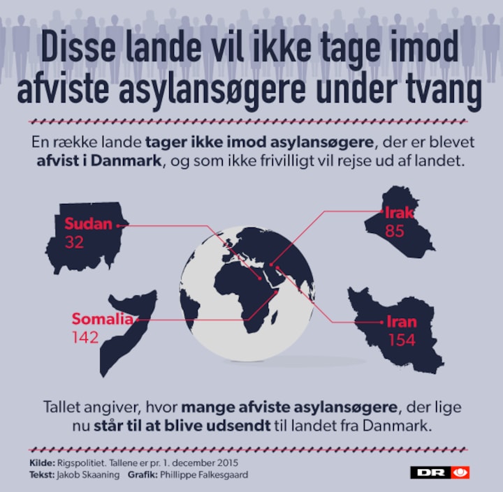 Fire af de lande, som de afviste asylansøgere kommer fra, vil nemlig ikke tage imod asylansøgere, der bliver sendt ud under tvang. Det er Iran, Irak, Somalia og Sudan.