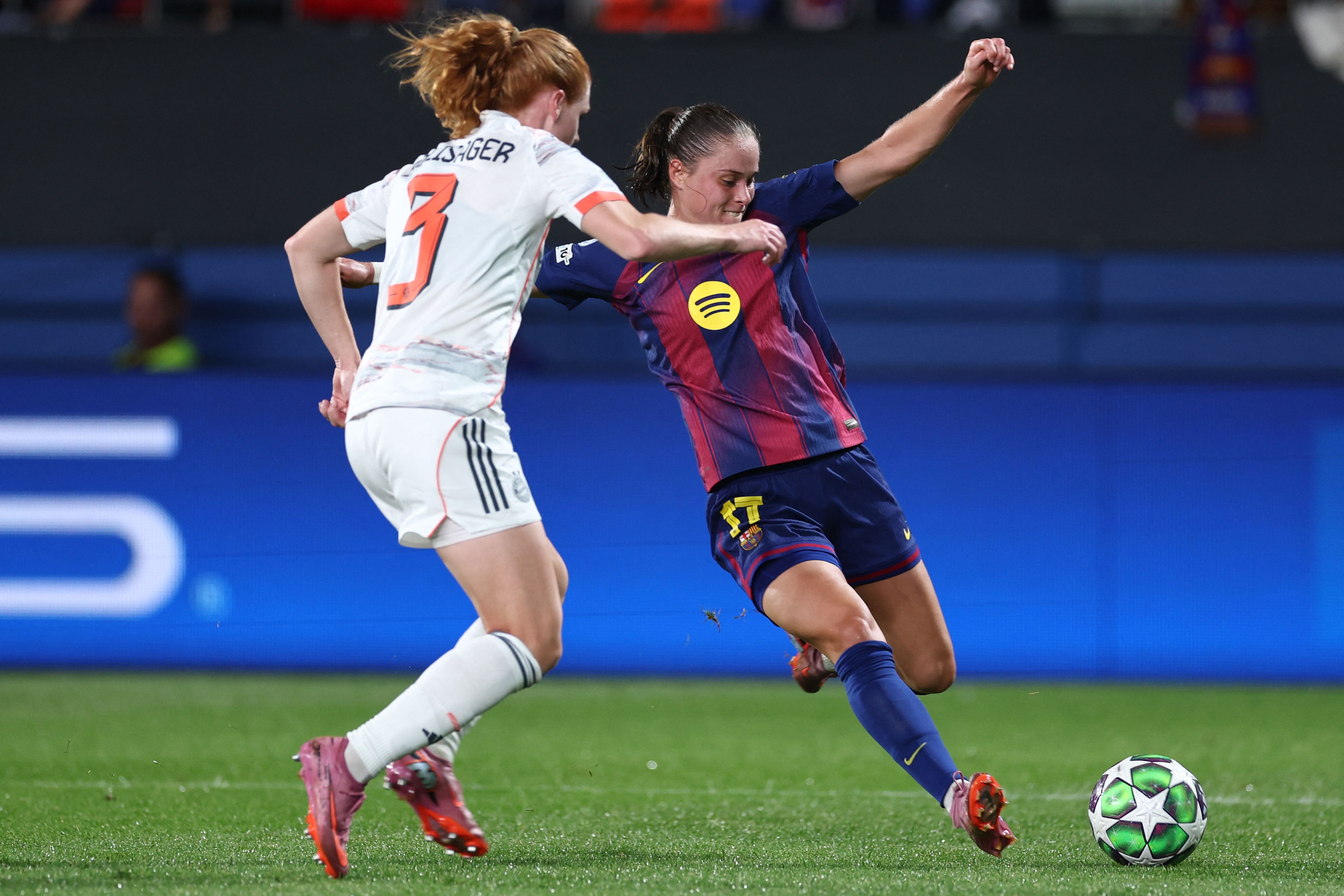 Barcelonas Polish forward #17 Ewa Pajor fights for the ball with Bayern Munichs Danish defender #03 Stine Ballisager Pedersen during the Womens Champions League, league phase day 1 football match between FC Barcelona and Bayern Munich at Johan Cruyff Stadium in Barcelona on October 7, 2025. (Photo by Josep LAGO / AFP) (Foto: © Josep Lago, AFP/Ritzau Scanpix)